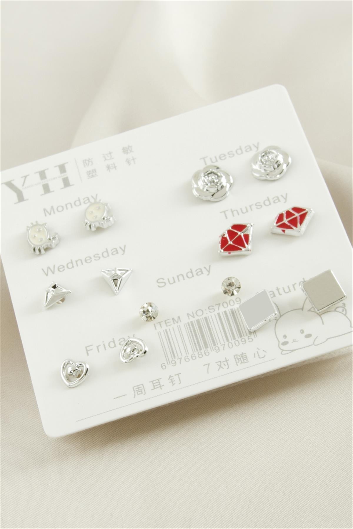 Küpe; Ürün malzemesi metal ve taştır. 1 kart olarak satılmaktadır. 1 kartta 14 adet küpe bulunmaktadır.