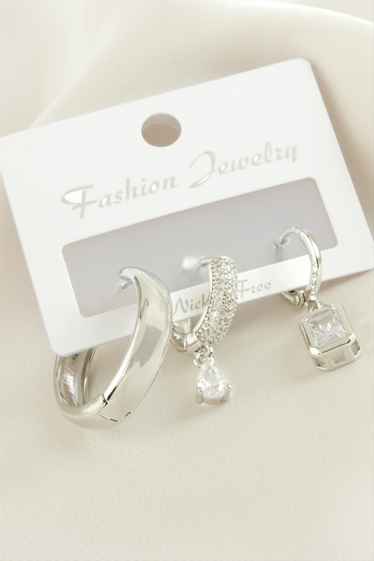 Küpe; Ürün malzemesi metal ve zirkon taşından imal edilmiştir. 1 sınıf kaliteli malzeme kullanılmıştır. Ürün boyu 2,5 cmdir. 1 kartta 3 adet küpe bulunmaktadır.