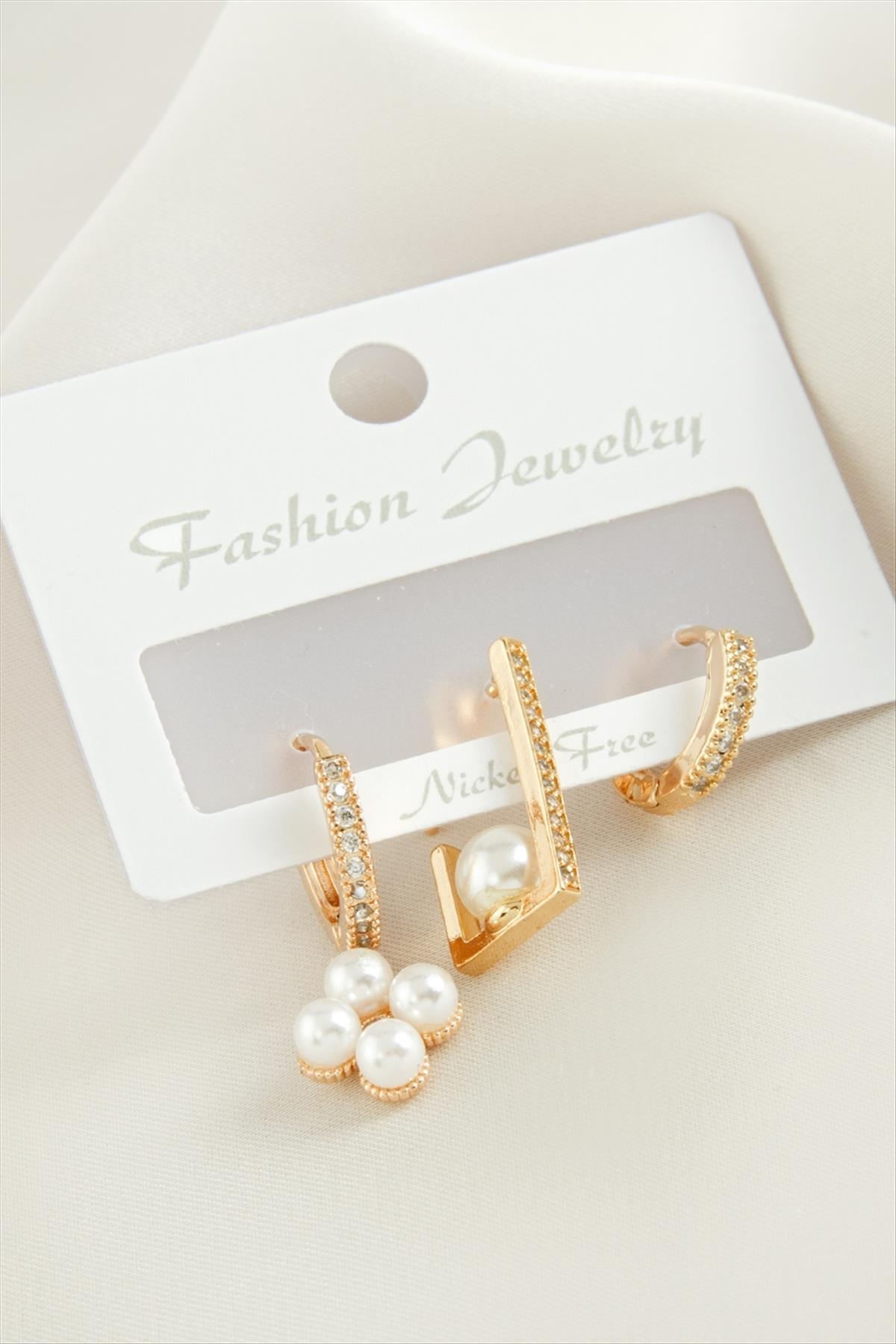 3 Adet Çiçek İnci Zirkon Taşlı Küpe