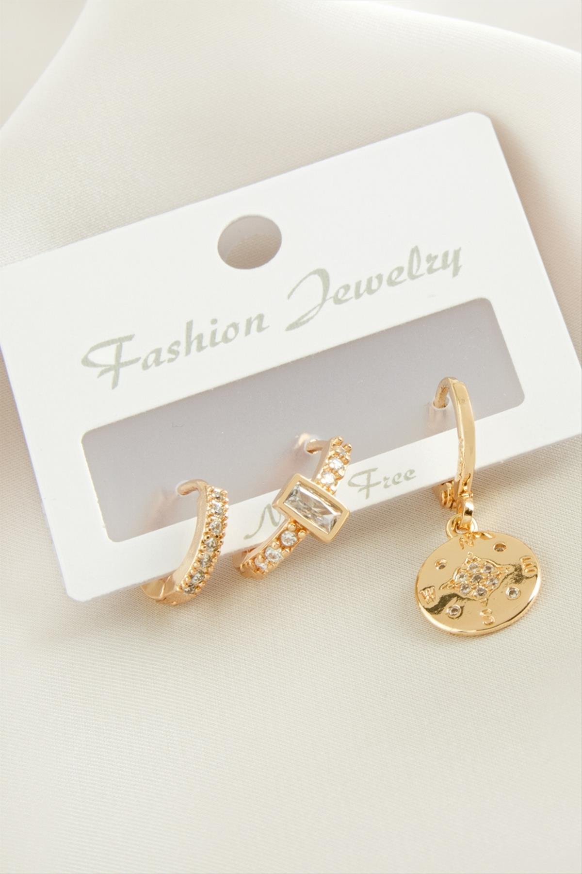 Küpe; Ürün malzemesi metal ve zirkon taşından imal edilmiştir. 1 sınıf kaliteli malzeme kullanılmıştır. Ürün boyu 3 cmdir. 1 kartta 3 adet küpe bulunmaktadır.