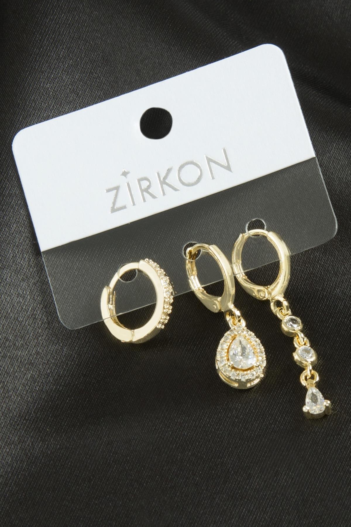 Küpe; Ürün malzemesi metal ve zirkon taşından imal edilmiştir. 1 sınıf malzeme kullanılmıştır. Ürün boyu yaklaşık 4,5 cmdir. 1 kartta 3 adet küpe bulunmaktadır.