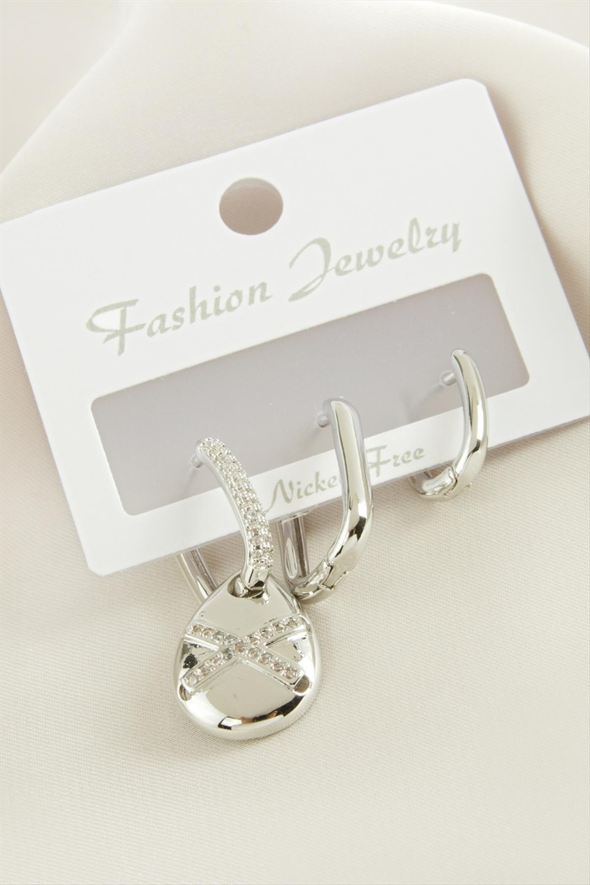 Küpe; Ürün malzemesi metal ve zirkon taşından imal edilmiştir. 1 sınıf kaliteli malzeme kullanılmıştır. Ürün boyu 2,5 cmdir. 1 kartta 3 adet küpe bulunmaktadır.