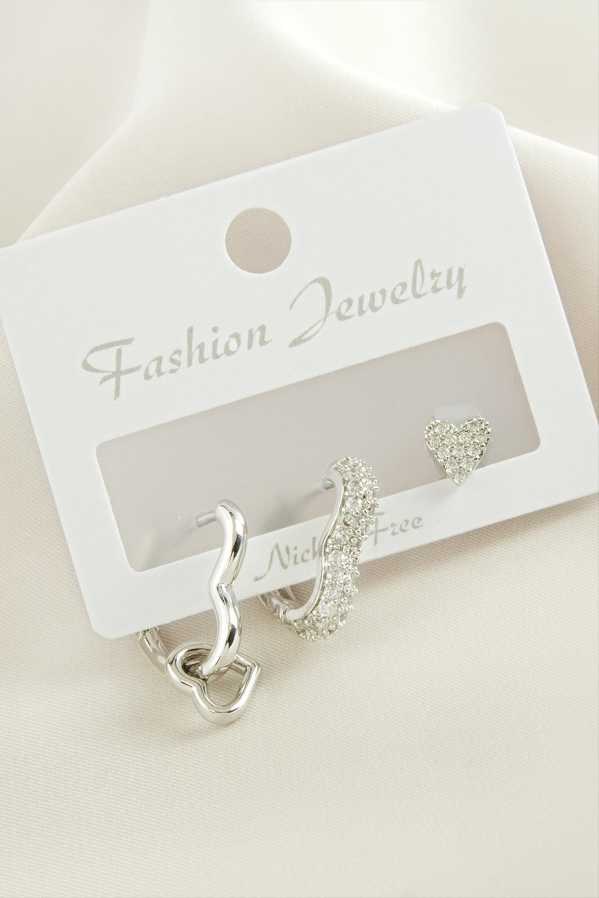 3 Adet Kalp Zirkon Taşlı Küpe