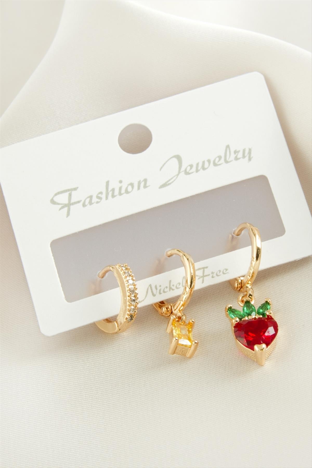 Küpe; Ürün malzemesi metal ve zirkon taşından imal edilmiştir. 1 sınıf kaliteli malzeme kullanılmıştır. Ürün boyu 3 cmdir. 1 kartta 3 adet küpe bulunmaktadır.