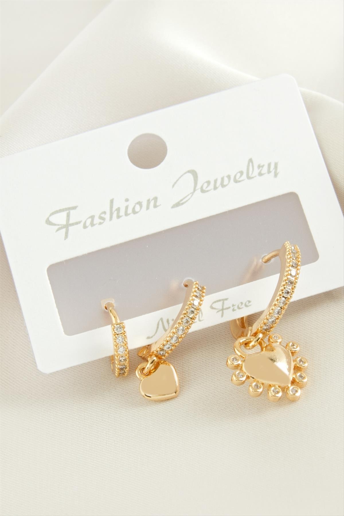 Küpe; Ürün malzemesi metal ve zirkon taşından imal edilmiştir. 1 sınıf kaliteli malzeme kullanılmıştır. Ürün boyu 2,5 cmdir. 1 kartta 3 adet küpe bulunmaktadır.