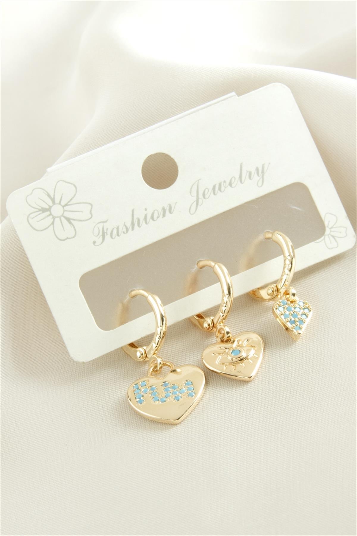Küpe; Ürün malzemesi metal ve zirkon taşından imal edilmiştir. 1 sınıf kaliteli malzeme kullanılmıştır. Ürün boyu 2,5 cmdir. 1 kartta 3 adet küpe bulunmaktadır.