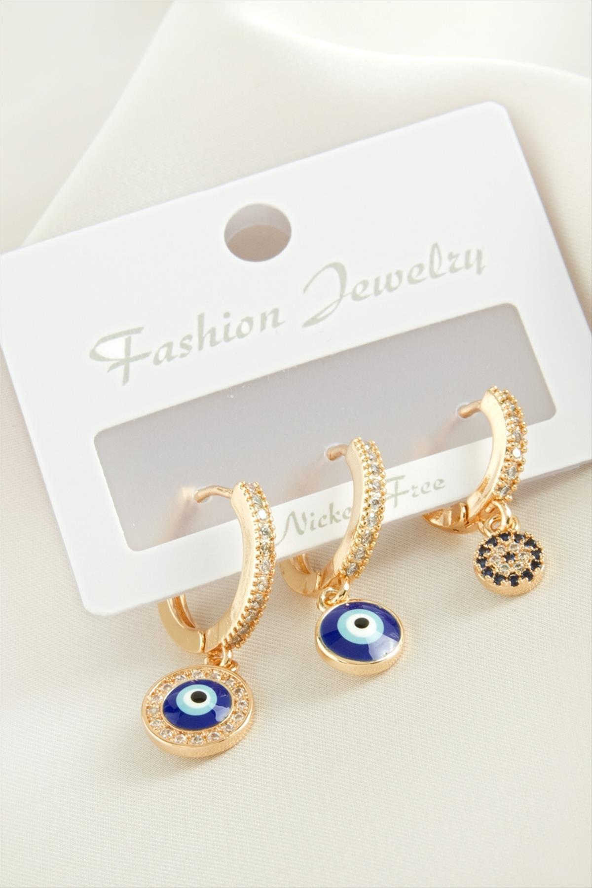 Küpe; Ürün malzemesi metal ve zirkon taşından imal edilmiştir. 1 sınıf kaliteli malzeme kullanılmıştır. Ürün boyu 2,5 cmdir. 1 kartta 3 adet küpe bulunmaktadır.