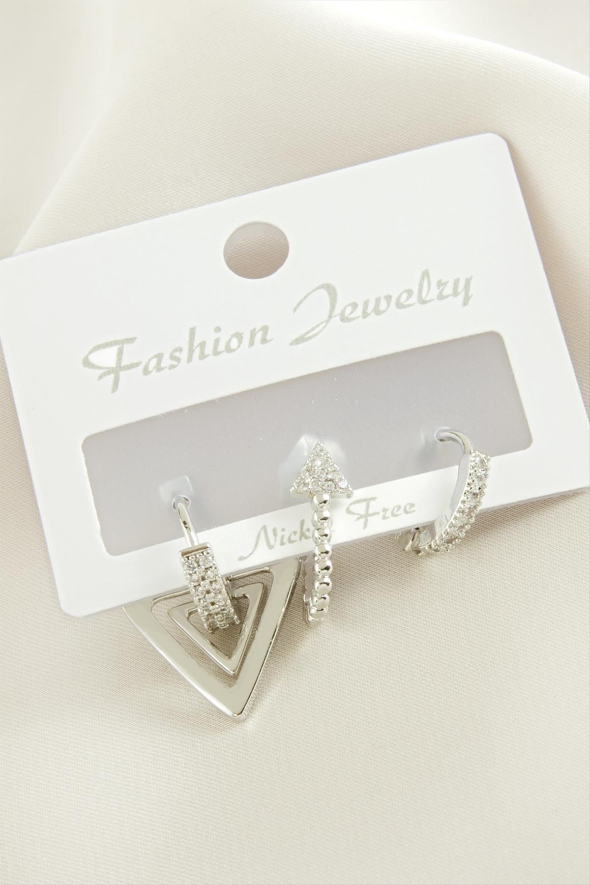 Küpe; Ürün malzemesi metal ve zirkon taşından imal edilmiştir. 1 sınıf kaliteli malzeme kullanılmıştır. Ürün boyu 2,5 cmdir. 1 kartta 3 adet küpe bulunmaktadır.