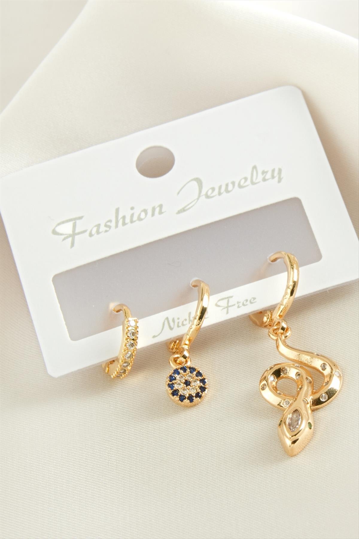 Küpe; Ürün malzemesi metal ve zirkon taşından imal edilmiştir. 1 sınıf kaliteli malzeme kullanılmıştır. Ürün boyu 3 cmdir. 1 kartta 3 adet küpe bulunmaktadır.