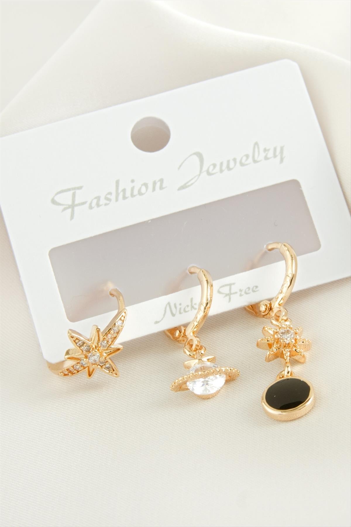 Küpe; Ürün malzemesi metal ve zirkon taşından imal edilmiştir. 1 sınıf kaliteli malzeme kullanılmıştır. Ürün boyu yaklaşık 3 cmdir. 1 kartta 3 adet küpe bulunmaktadır.