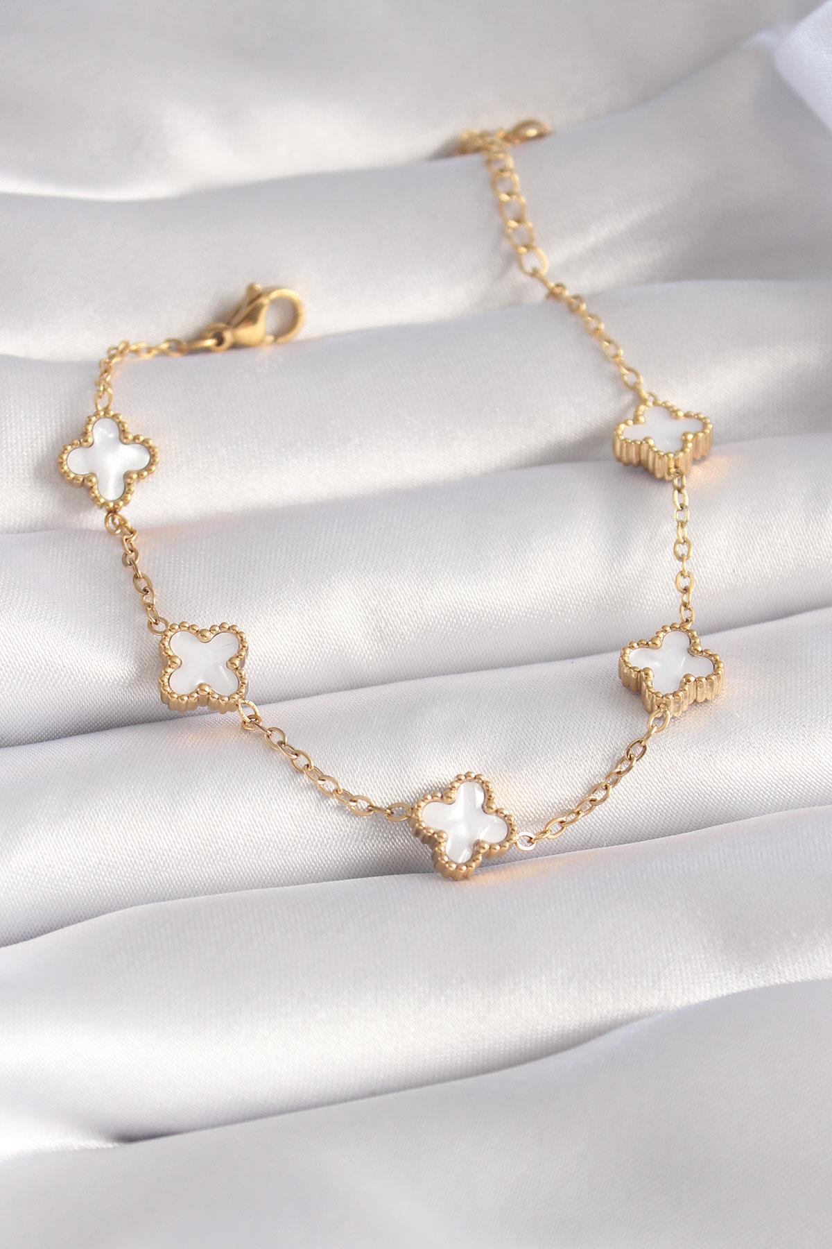 316L Çelik Gold Renk Beyaz Yonca Model Kadın Bileklik