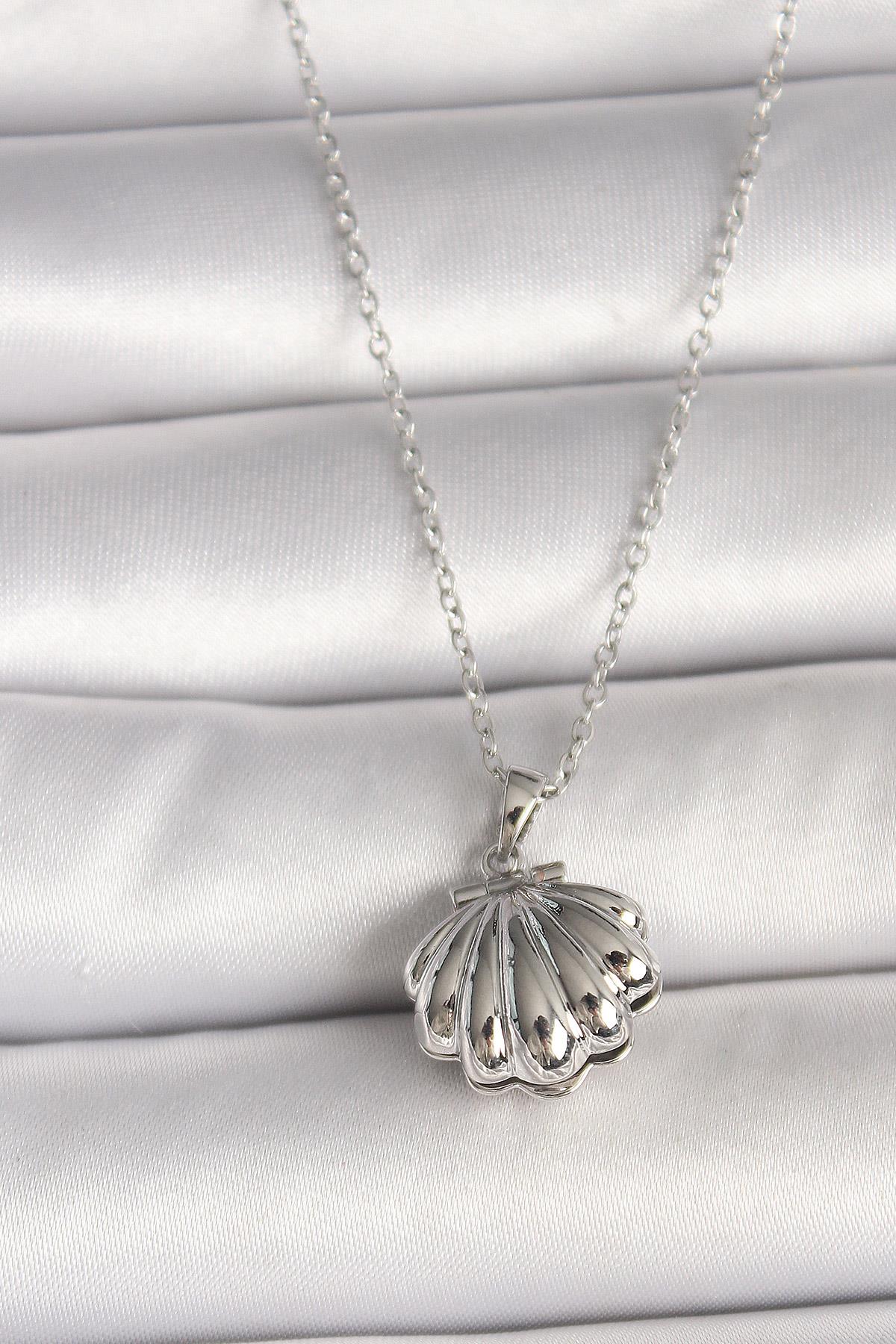 316L Çelik Gümüş Renk Zincir Açılır İncili Midye Model Kadın Kolye