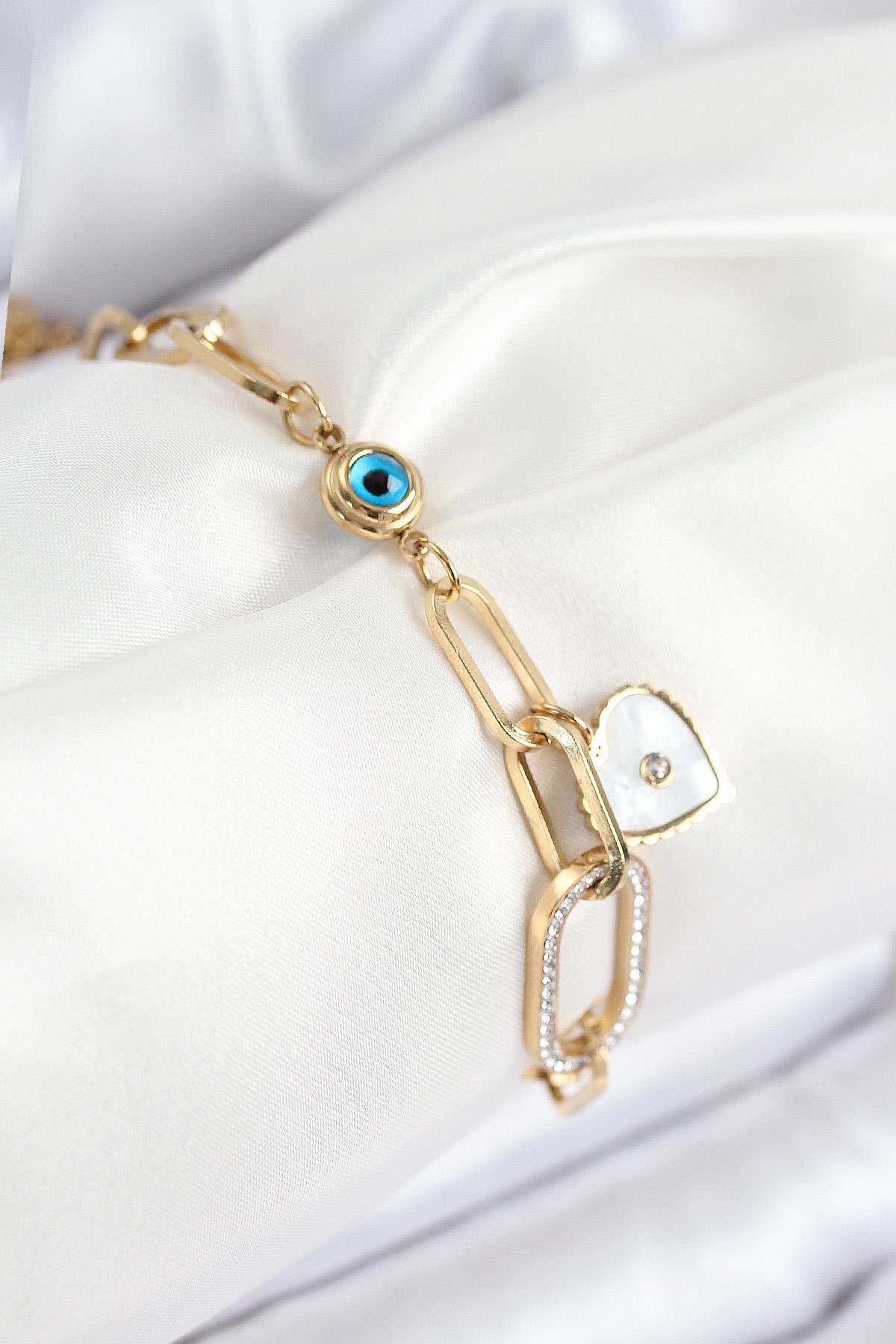 316L Çelik Nazar Boncuğu Ve Zirkon Taşlı Kalp Model Gold Renk Kadın Bileklik