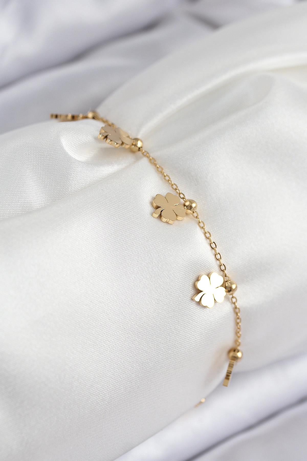 316L Çelik Sıralı Yonca Model Gold Renk Kadın Bileklik
