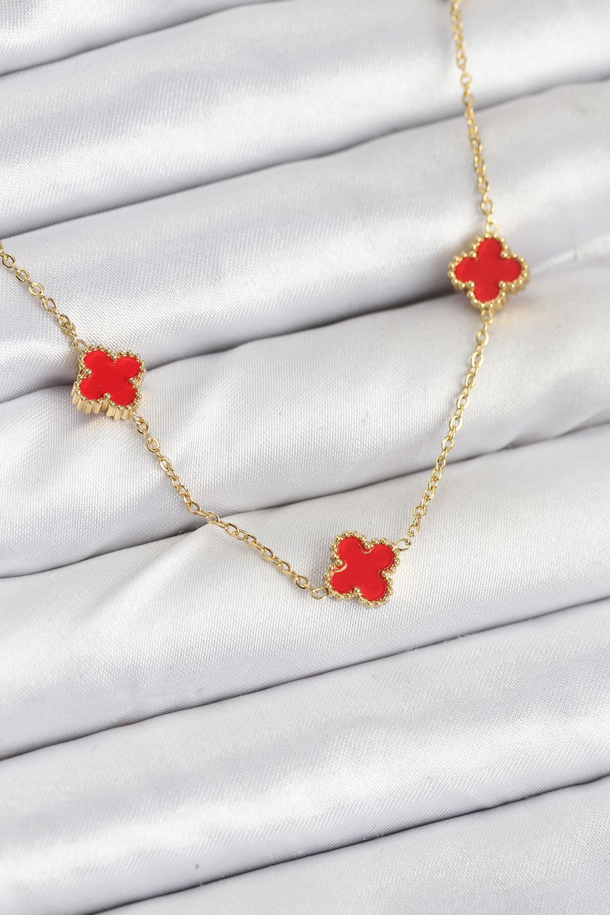 316L Çelik Zincir Gold Renk Kırmızı Baby Boy Yonca Kadın Kolye - PRT3500EB08935