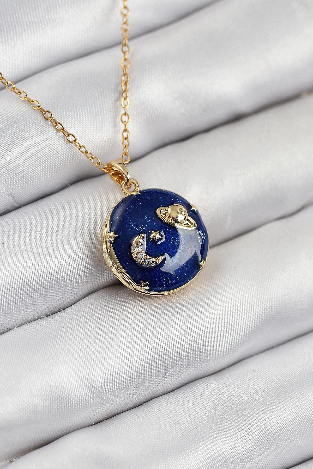 316L Çelik Zirkon Taşlı Açılabilr Kapaklı Gezegen Model Gold Renk Kadın Kolye