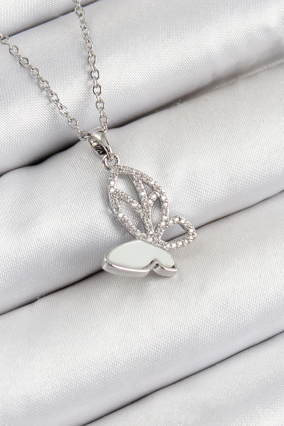316L Çelik Zirkon Taşlı Kelebek Model Gümüş Renk Kadın Kolye - PRT3500EB07641