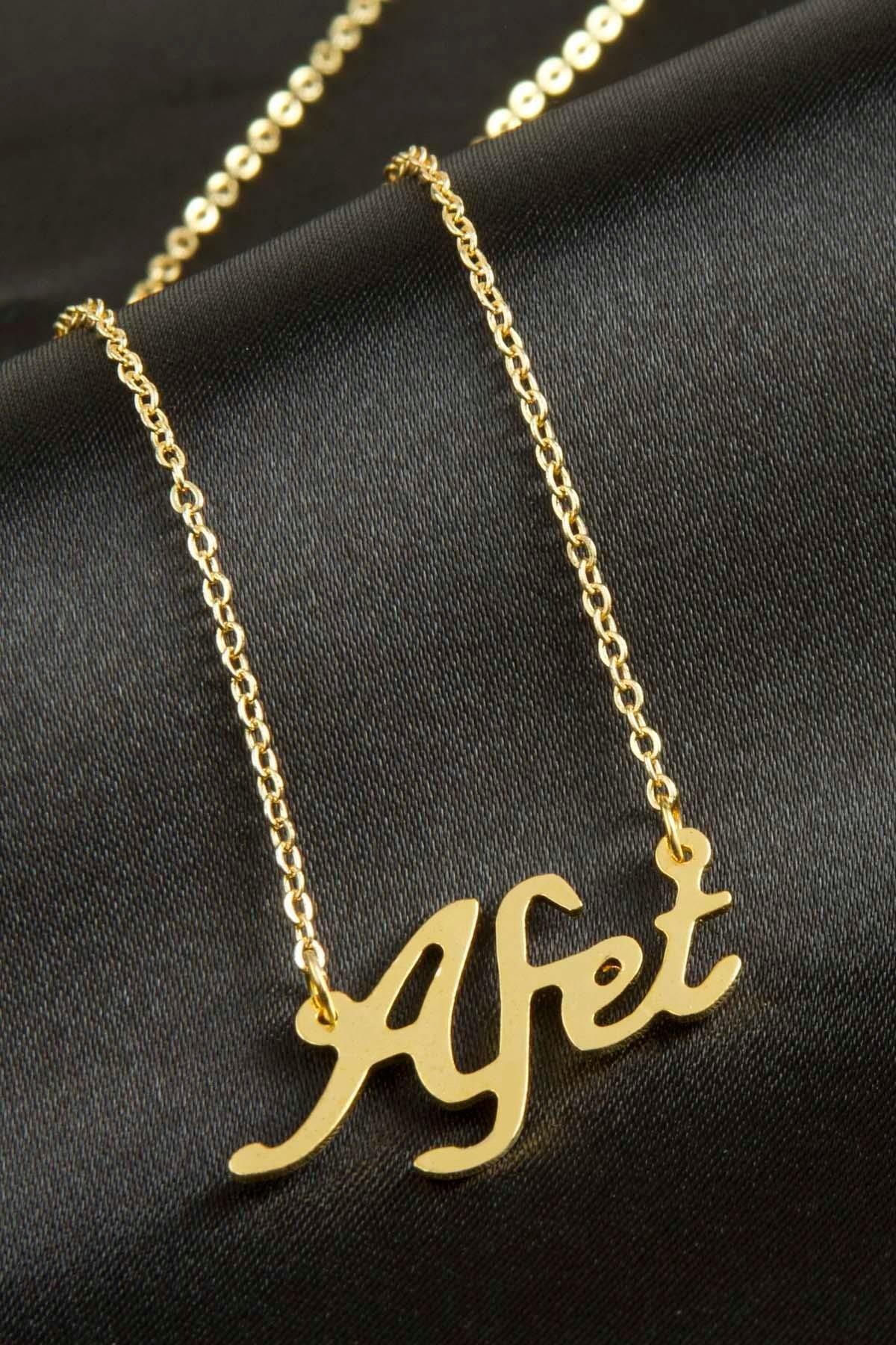 Afet isimli kolye. İsimli kolye pirinç madeninden ve altın kaplamalıdır. Kişiye özel üretilmektedir.Yazdırmak istediğiniz ismi bize mesaj olarak iletmeniz gerekmektedir. Kullanıma bağlı olarak uzun süre kullanıma uygundur. Ürün malzemesi 1.sınıf kalitededir. Ürün ve zinciri sarı renktedir. Ürün zincir boyu 45 cm ve ürün üzerindeki isimler yaklaşık 3 cmdir. İsim boyları ürün ismine göre degişiklik göstermektedir.