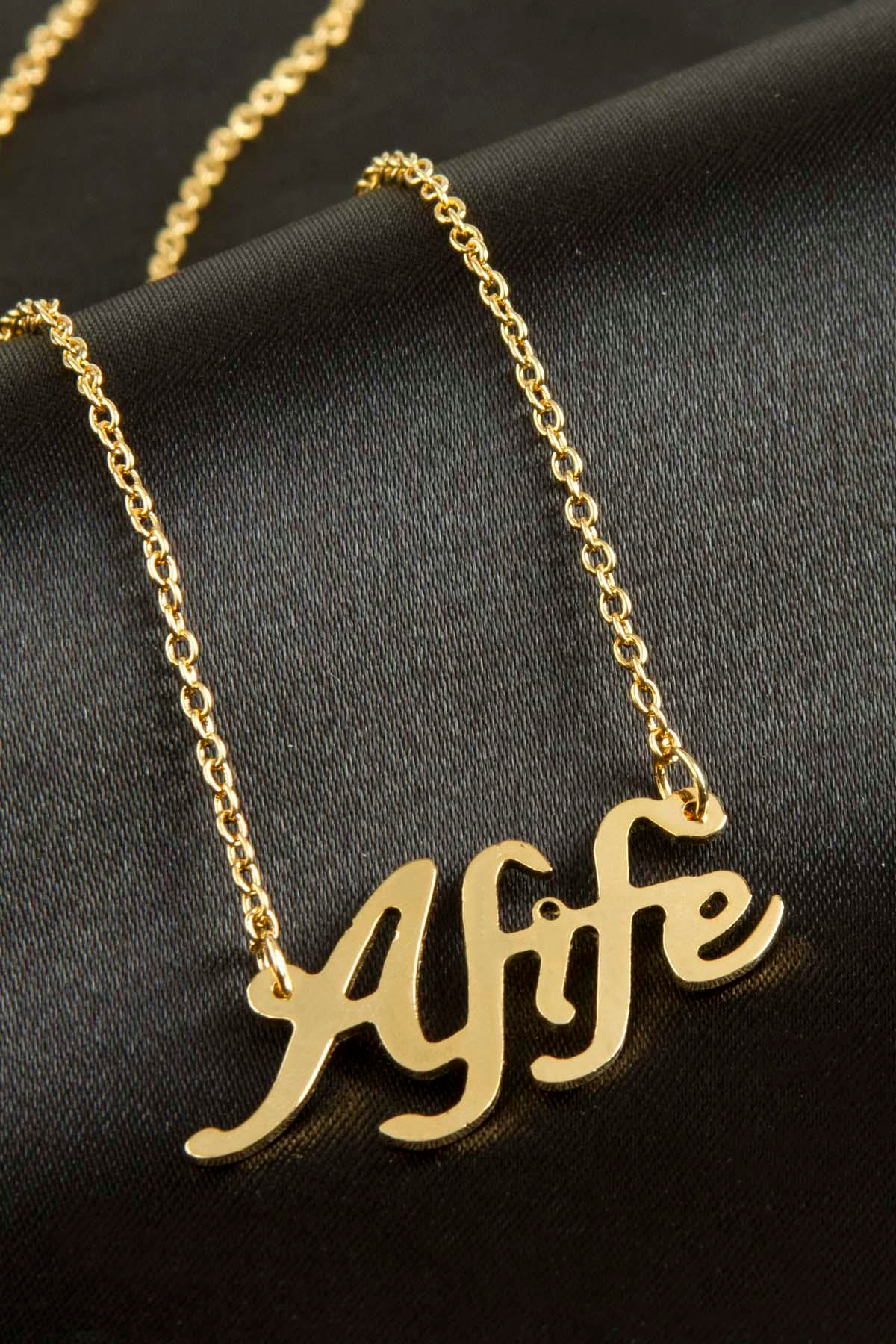 Afife isimli kolye. İsimli kolye pirinç madeninden ve altın kaplamalıdır. Kişiye özel üretilmektedir.Yazdırmak istediğiniz ismi bize mesaj olarak iletmeniz gerekmektedir. Kullanıma bağlı olarak uzun süre kullanıma uygundur. Ürün malzemesi 1.sınıf kalitededir. Ürün ve zinciri sarı renktedir. Ürün zincir boyu 45 cm ve ürün üzerindeki isimler yaklaşık 3 cmdir. İsim boyları ürün ismine göre degişiklik göstermektedir.