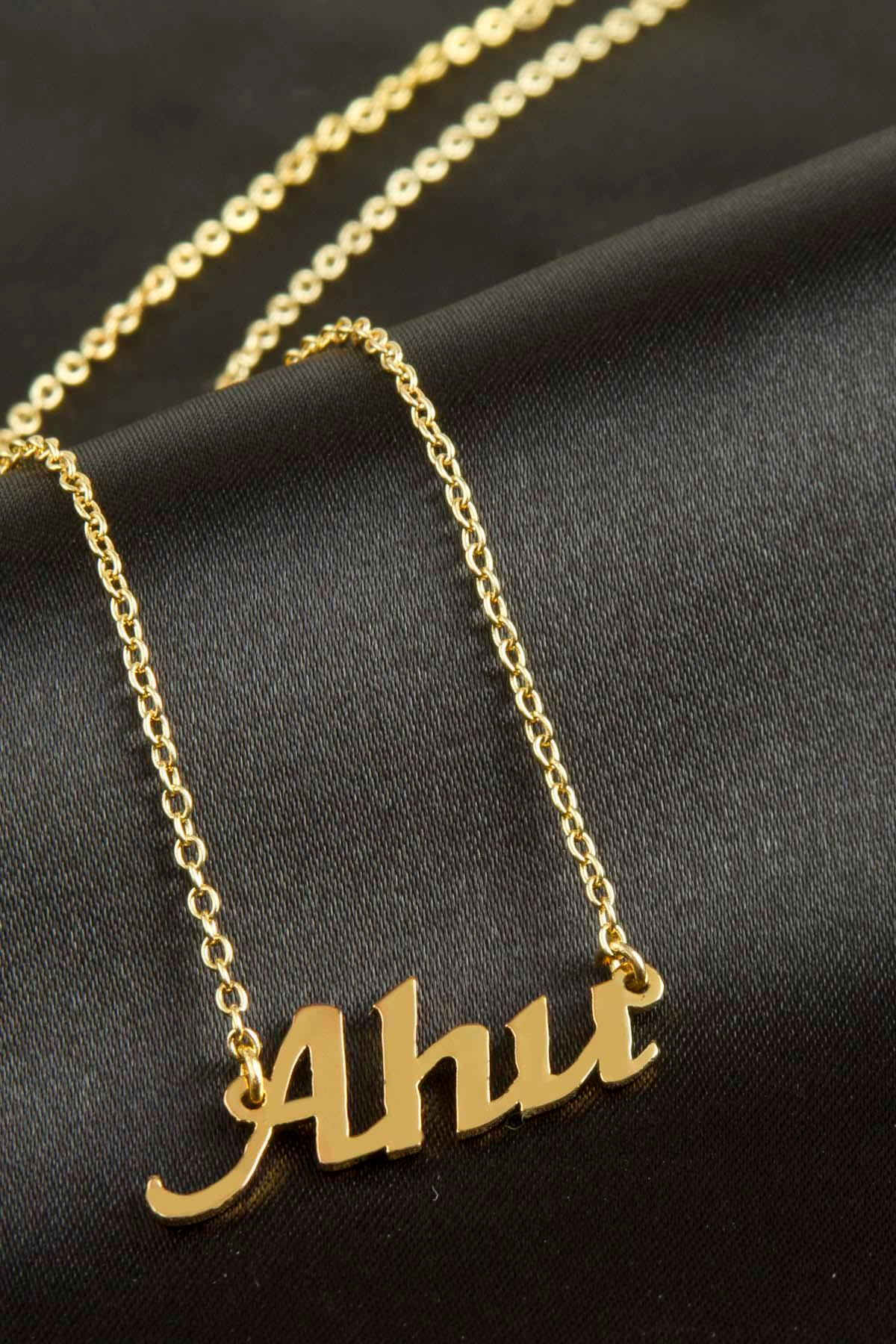 Ahu isimli kolye. İsimli kolye pirinç madeninden ve altın kaplamalıdır. Kişiye özel üretilmektedir.Yazdırmak istediğiniz ismi bize mesaj olarak iletmeniz gerekmektedir. Kullanıma bağlı olarak uzun süre kullanıma uygundur. Ürün malzemesi 1.sınıf kalitededir. Ürün ve zinciri sarı renktedir. Ürün zincir boyu 45 cm ve ürün üzerindeki isimler yaklaşık 3 cmdir. İsim boyları ürün ismine göre degişiklik göstermektedir.