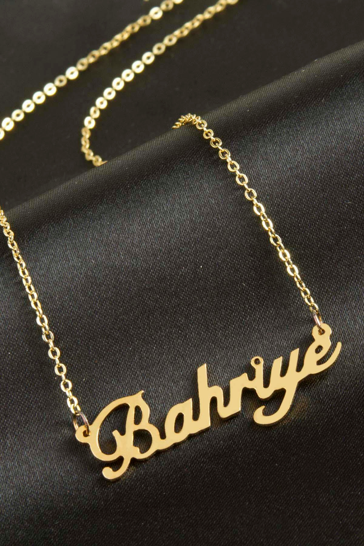 Bahriye isimli kolye. İsimli kolye pirinç madeninden ve altın kaplamalıdır. Kişiye özel üretilmektedir.Yazdırmak istediğiniz ismi bize mesaj olarak iletmeniz gerekmektedir. Kullanıma bağlı olarak uzun süre kullanıma uygundur. Ürün malzemesi 1.sınıf kalitededir. Ürün ve zinciri sarı renktedir. Ürün zincir boyu 45 cm ve ürün üzerindeki isimler yaklaşık 3 cmdir. İsim boyları ürün ismine göre degişiklik göstermektedir.