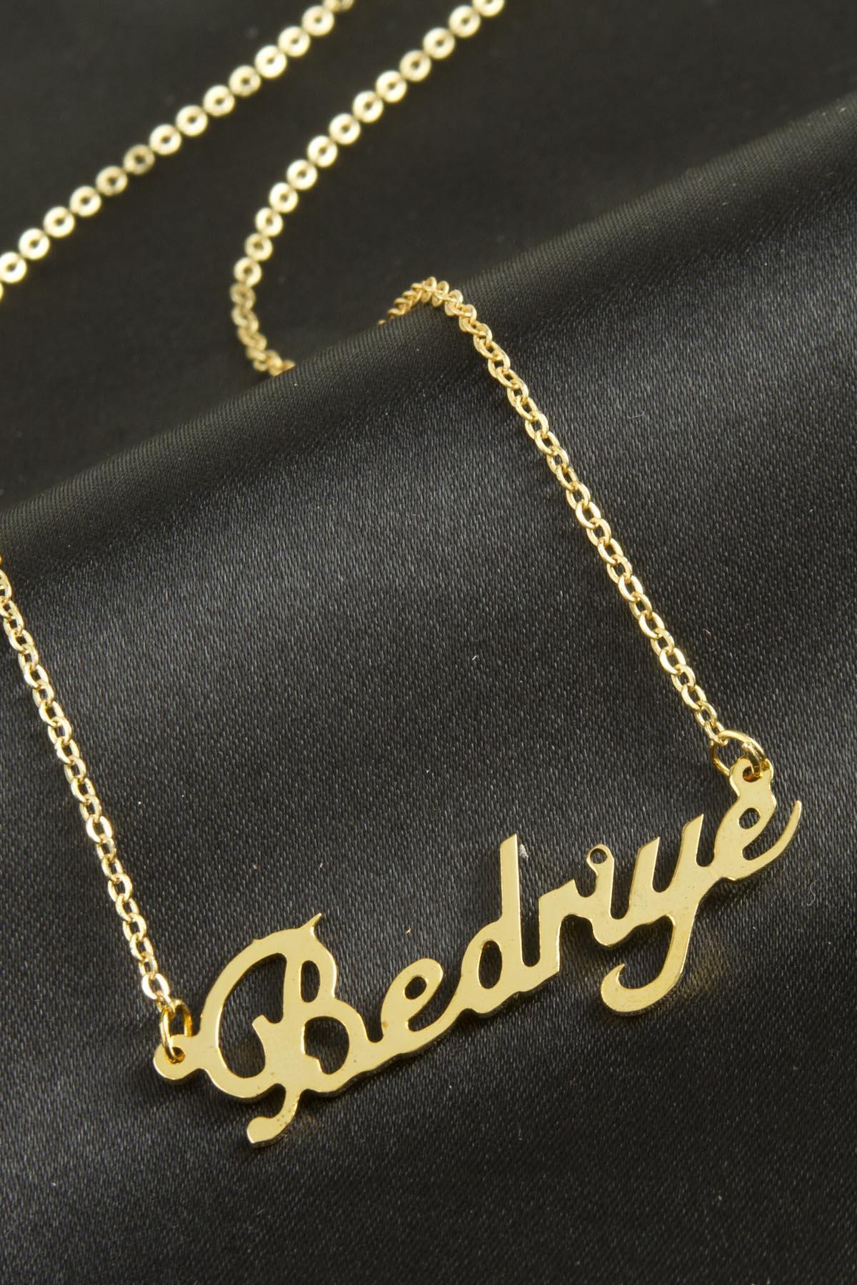 Bedriye isimli kolye. İsimli kolye pirinç madeninden ve altın kaplamalıdır. Kişiye özel üretilmektedir.Yazdırmak istediğiniz ismi bize mesaj olarak iletmeniz gerekmektedir. Kullanıma bağlı olarak uzun süre kullanıma uygundur. Ürün malzemesi 1.sınıf kalitededir. Ürün ve zinciri sarı renktedir. Ürün zincir boyu 45 cm ve ürün üzerindeki isimler yaklaşık 3 cmdir. İsim boyları ürün ismine göre degişiklik göstermektedir.