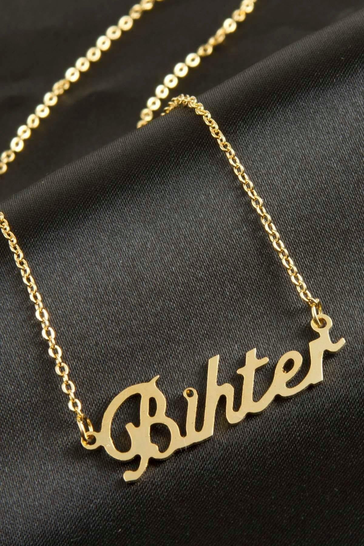 Bihter İsimli Kolye. İsimli kolye pirinç madeninden ve altın kaplamalıdır. Kişiye özel üretilmektedir.Yazdırmak istediğiniz ismi bize mesaj olarak iletmeniz gerekmektedir. Kullanıma bağlı olarak uzun süre kullanıma uygundur. Ürün malzemesi 1.sınıf kalitededir. Ürün ve zinciri sarı renktedir. Ürün zincir boyu 45 cm ve ürün üzerindeki isimler yaklaşık 3 cmdir. İsim boyları ürün ismine göre degişiklik göstermektedir.