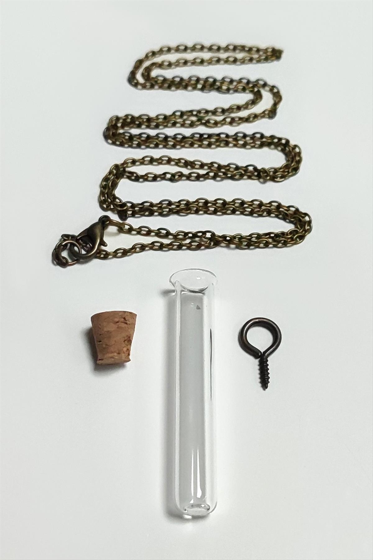 Kolye; Ürün malzemesi cam ve metaldir. Ürün cam boyu 8*50 mm ve zincir boyu 60 cmdir. Ürün demonte şeklinde gönderilecektir. İstediğiniz aparatı içine koyarak kullanabilirsiniz.