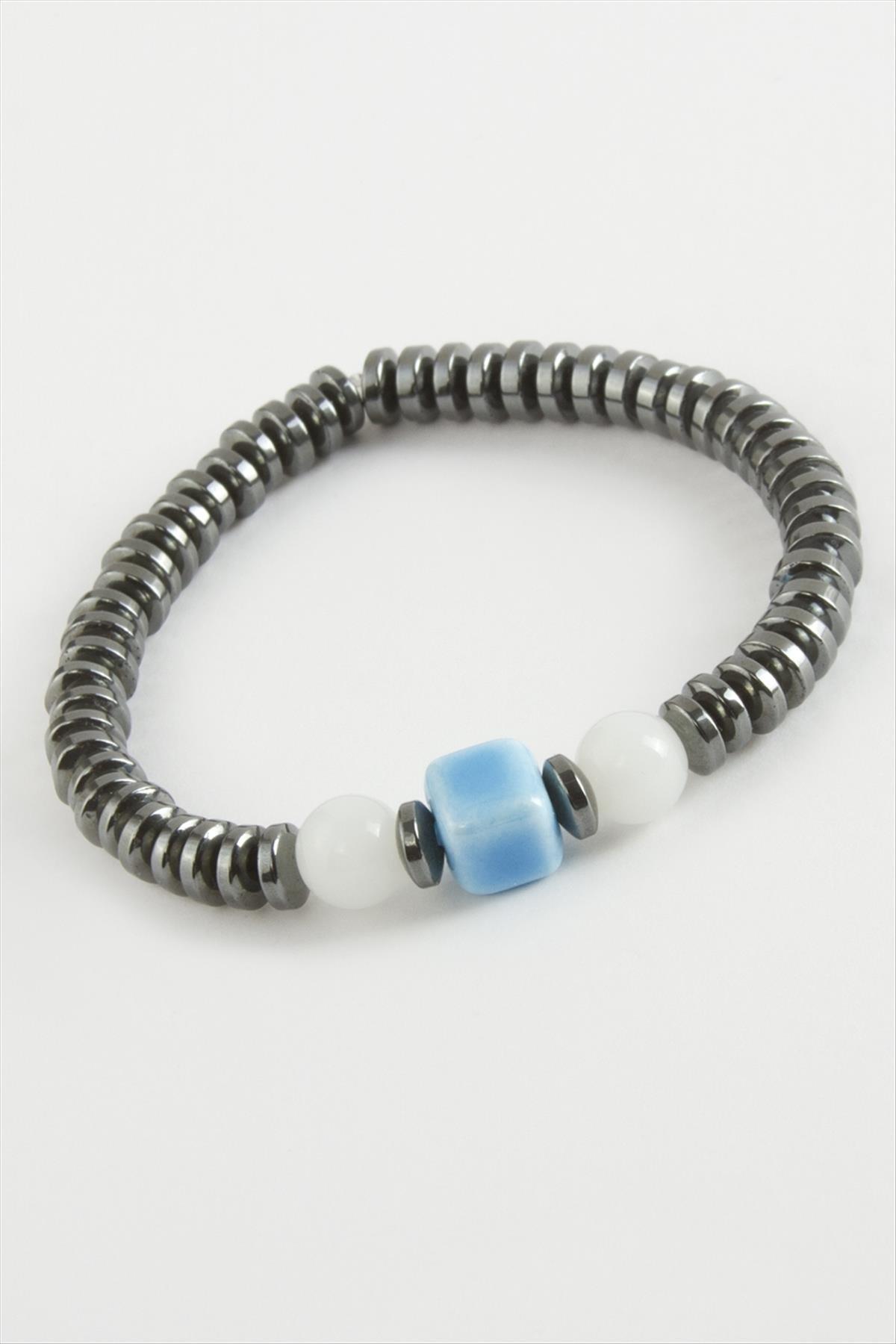 Bileklik: Ürün malzemesi murano cam ve hematit doğaltaşından imal edilmiştir. Misina üzerine dizilmiş ve esneme özelliği bulunmaktadır.