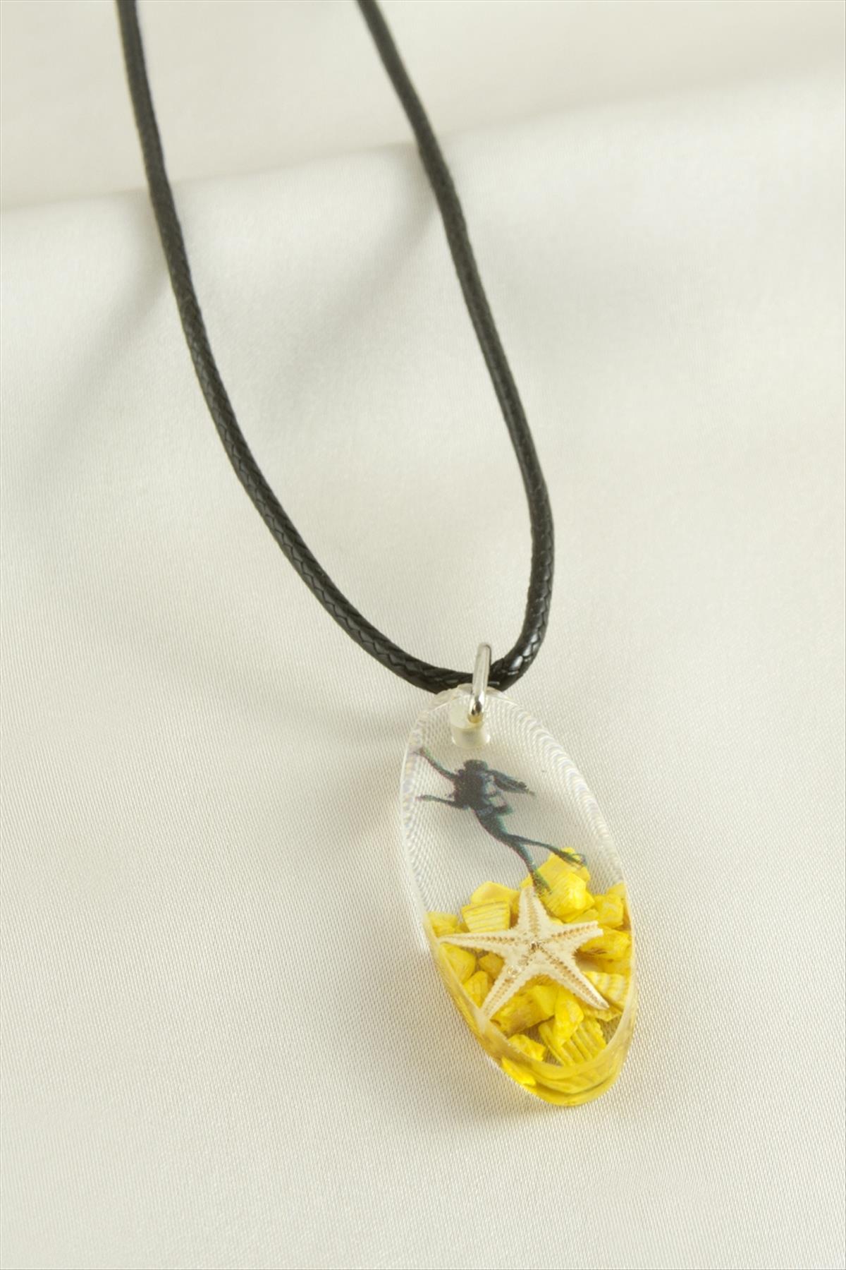 Epoksi Kolye; Ürün malzemesi deri ve epoksi malzemeden üretilmiştir. Ürün 1 sınıf kristal epoksi malzeme kullanılmıştır. Kolye deri ip uzunluğu 50 cm ve ucundaki epoksi 3,5 cmdir.