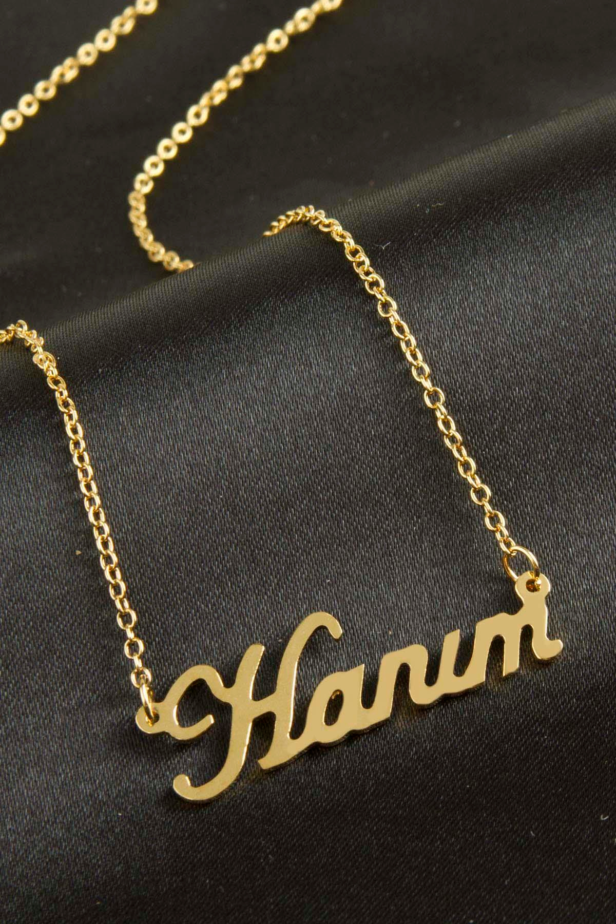 Hanım isimli kolye. İsimli kolye pirinç madeninden ve altın kaplamalıdır. Kişiye özel üretilmektedir.Yazdırmak istediğiniz ismi bize mesaj olarak iletmeniz gerekmektedir. Kullanıma bağlı olarak uzun süre kullanıma uygundur. Ürün malzemesi 1.sınıf kalitededir. Ürün ve zinciri sarı renktedir. Ürün zincir boyu 45 cm ve ürün üzerindeki isimler yaklaşık 3 cmdir. İsim boyları ürün ismine göre degişiklik göstermektedir.
