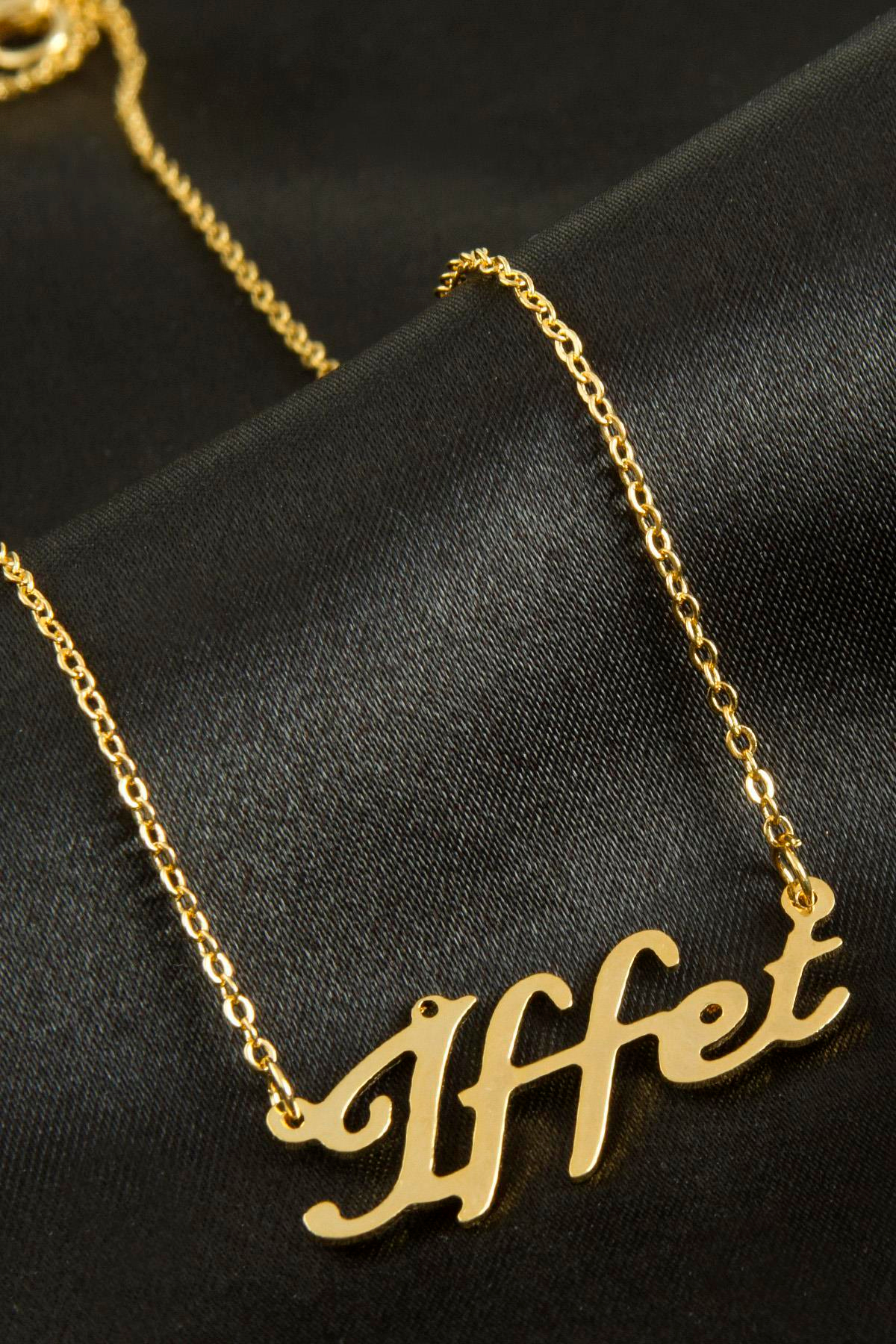 İffet isimli kolye. İsimli kolye pirinç madeninden ve altın kaplamalıdır. Kişiye özel üretilmektedir.Yazdırmak istediğiniz ismi bize mesaj olarak iletmeniz gerekmektedir. Kullanıma bağlı olarak uzun süre kullanıma uygundur. Ürün malzemesi 1.sınıf kalitededir. Ürün ve zinciri sarı renktedir. Ürün zincir boyu 45 cm ve ürün üzerindeki isimler yaklaşık 3 cmdir. İsim boyları ürün ismine göre degişiklik göstermektedir.