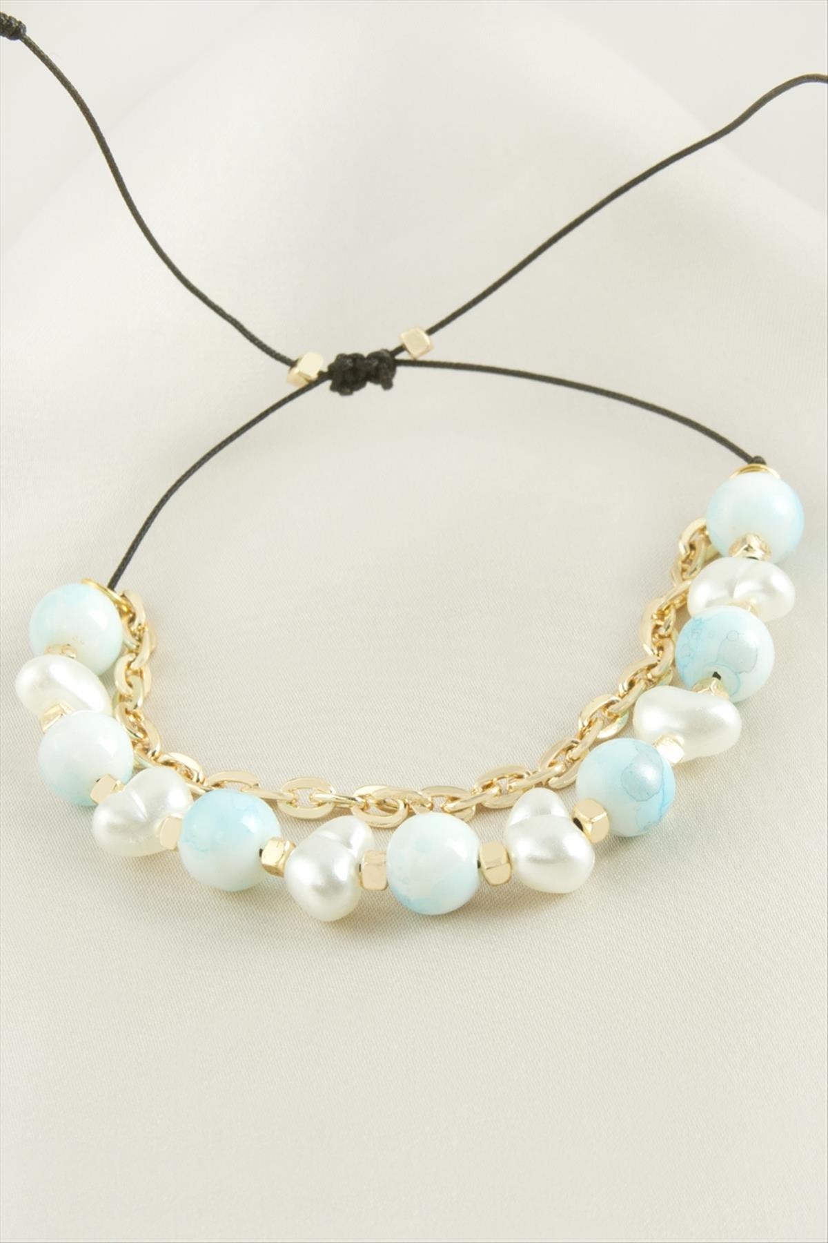 Bileklik; Ürün malzemesi metal, inci, boncuk ve makrome iptir. Arkası asansörlüdür Bileğe göre ayarlamalıdır. Kartlıdır.
