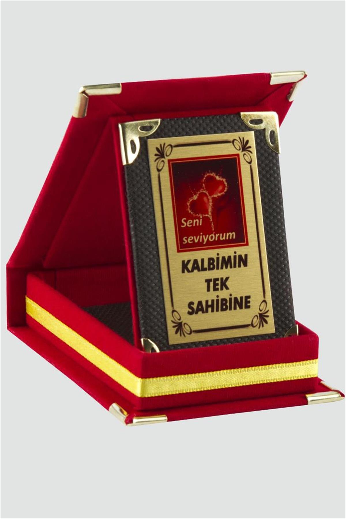 Süet kutulu plaket, metal üzerine yazı yazılarak üretilmiştir, ölçüleri kurulu vaziyette; yükseklik: 11cm, genişlik: 8cm'dir.