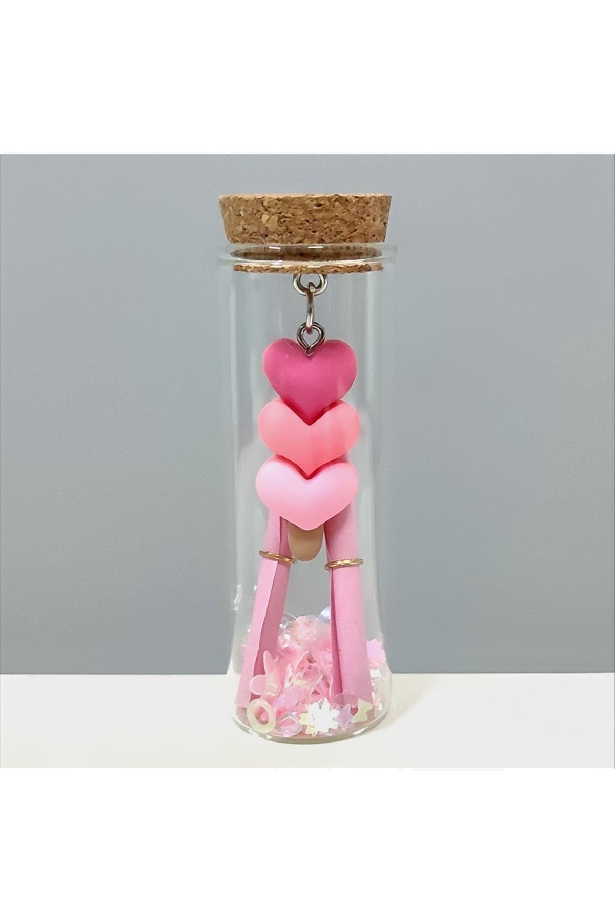 Şişe; Ürün tamamen cam malzemeden üretilmişdir. Şişenin içersin de plastik kalp ve boş bir kağıt bulunmaktadır. Ürün boyu 7 cmdir. Genişliği 2 cmdir.