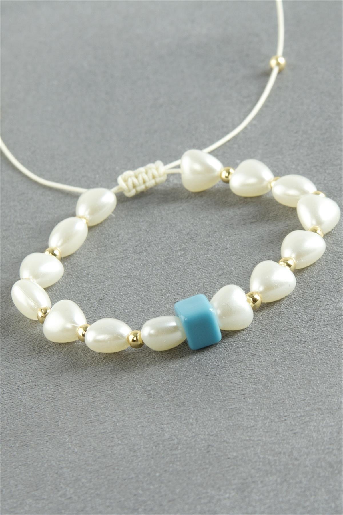Bileklik; Ürün malzemesi inci ve makrome iptir. Ürün arkası asansörlüdür. Bileğe göre ayarlanabilir.
