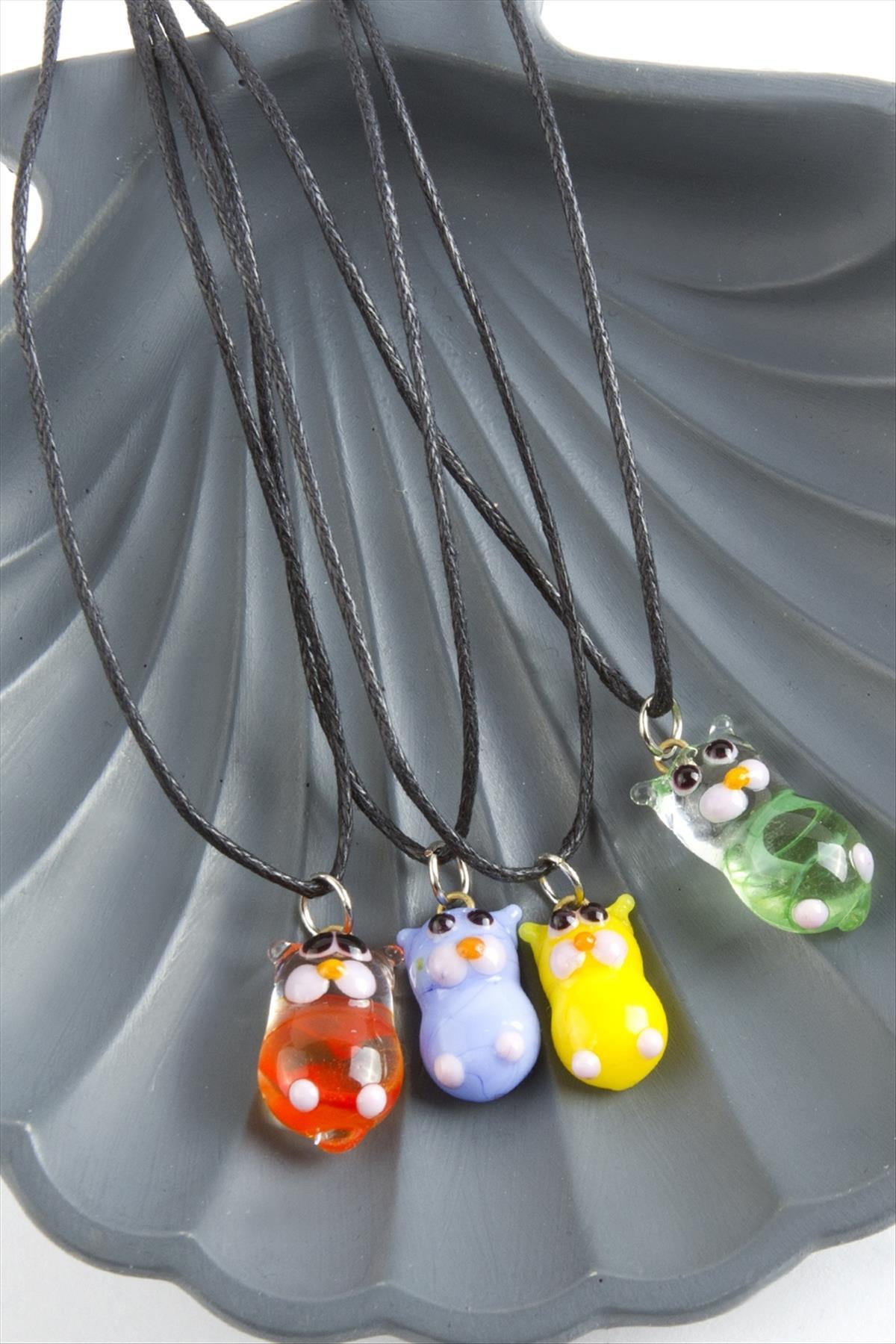 Cam Kolye; Kordonu vinlex deridir. Ürün ustalarımız tarafından atölyemizde tek tek el işçiliği ile üretilmektedir. İmalatımız da yerli cam ve orijinal italyan cam kullanılmaktadır. Cam ürünlerinde sanatsal bir işçilikle çalışılmaktadır. Ürün asortilidir. Siparişleriniz de karışık olarak gönderilecektir. Ürün cam boyu 1,5 cm ve ip boyu 45 cmdir.