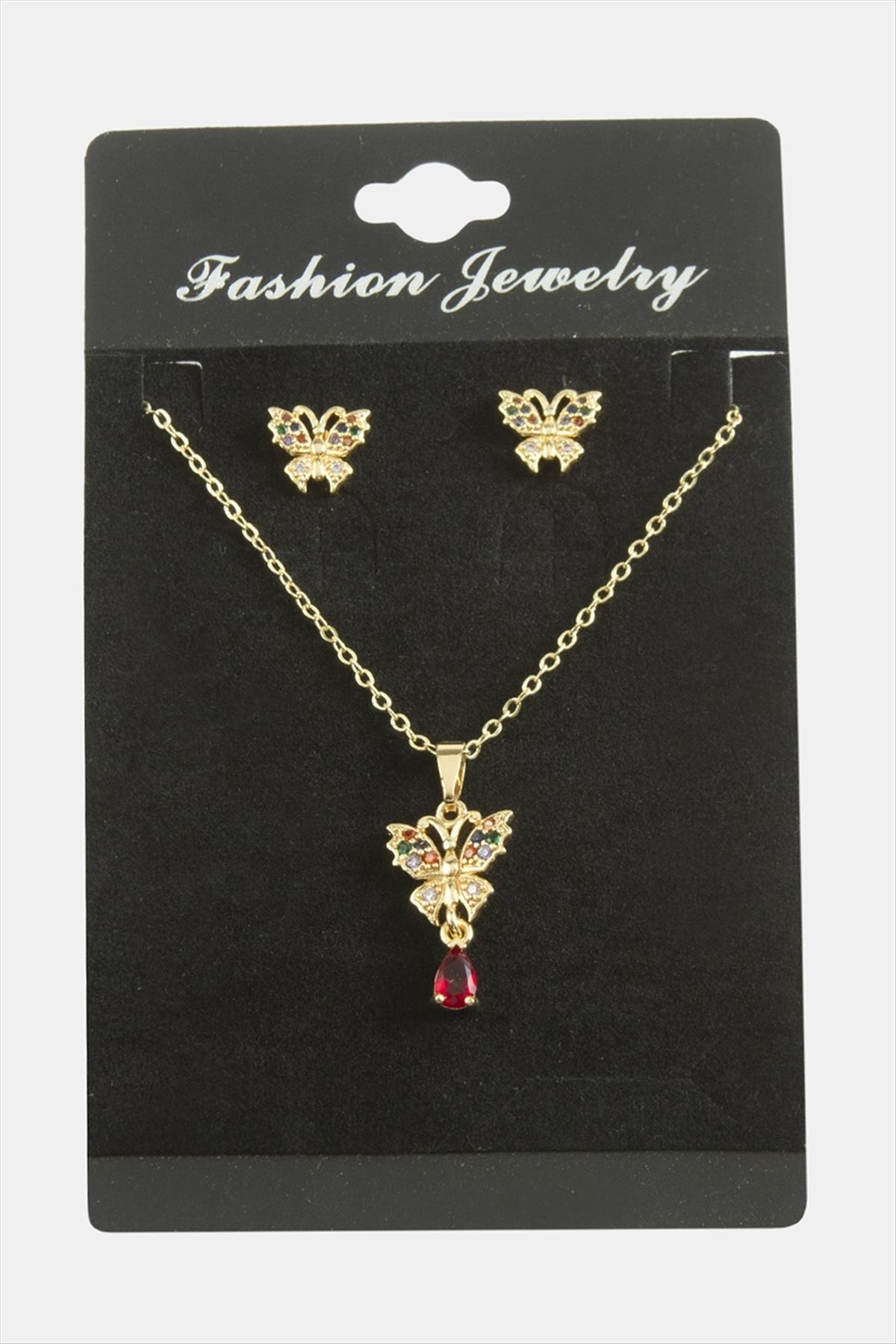 Kolye; Ürün malzemesi metal ve zirkon taştan üretilmiştir. 1 sınıf kaliteli malzeme kullanılmıştır. Ürün 1 adet kolye, ve 1 adet çift küpe vardır. Ürün zincir uzunluğu 45 santimdir. Ürün ucundaki taşlı aparat boyu 1,5 cmdir.