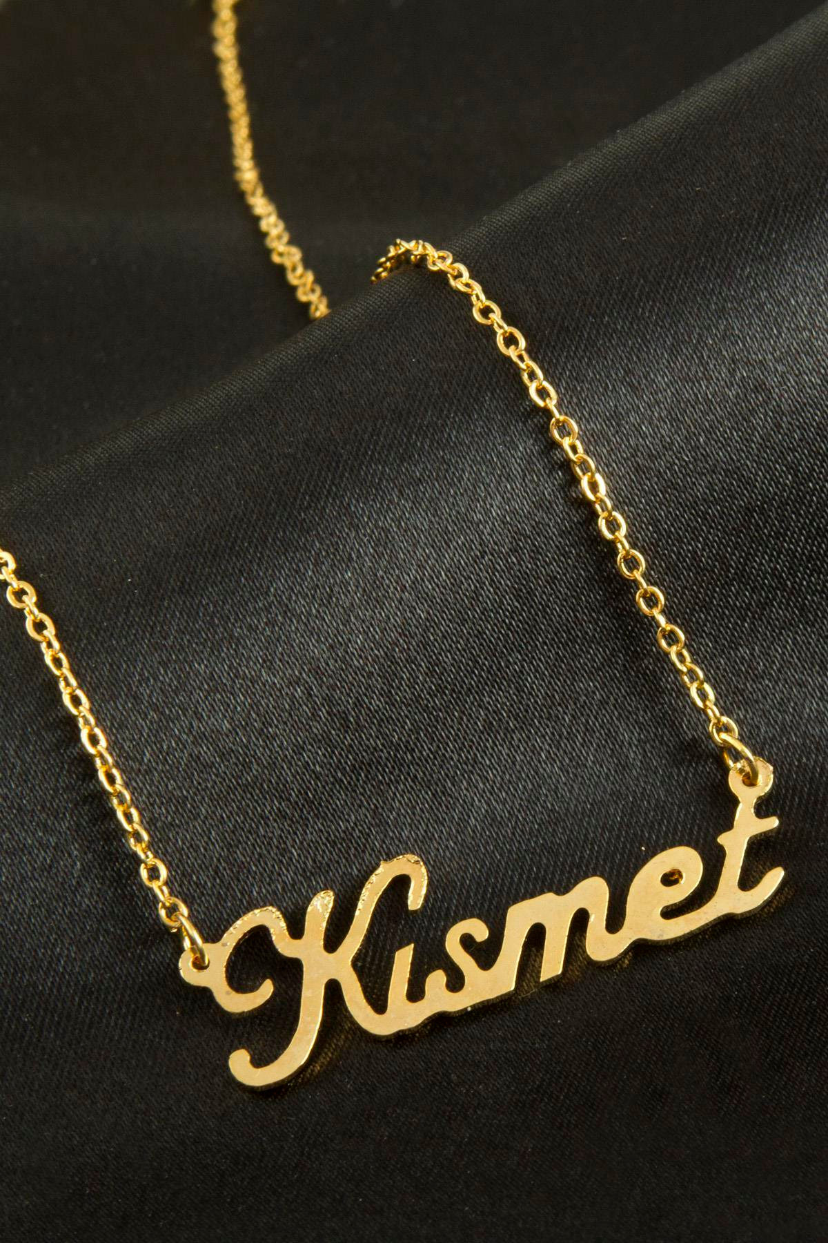 Kısmet isimli kolye. İsimli kolye pirinç madeninden ve altın kaplamalıdır. Kişiye özel üretilmektedir.Yazdırmak istediğiniz ismi bize mesaj olarak iletmeniz gerekmektedir. Kullanıma bağlı olarak uzun süre kullanıma uygundur. Ürün malzemesi 1.sınıf kalitededir. Ürün ve zinciri sarı renktedir. Ürün zincir boyu 45 cm ve ürün üzerindeki isimler yaklaşık 3 cmdir. İsim boyları ürün ismine göre degişiklik göstermektedir.