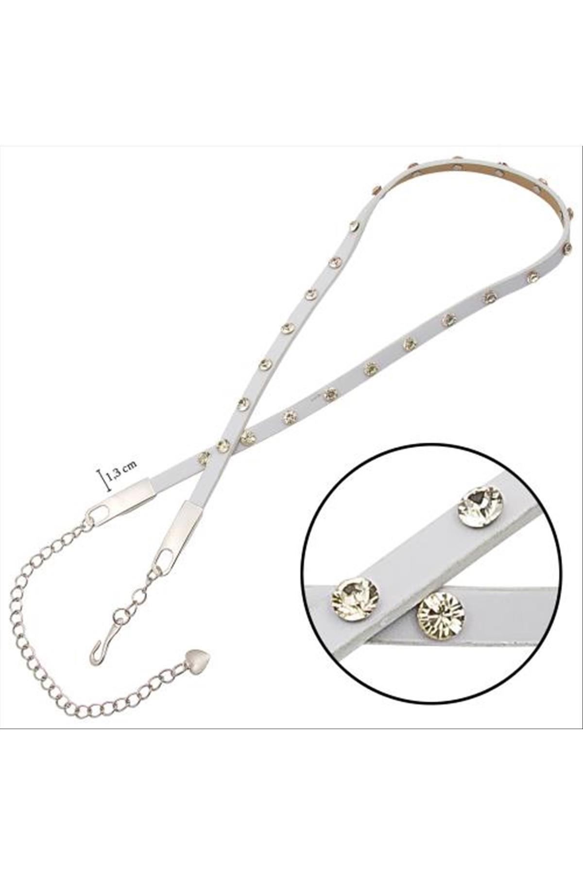 Ayarlanabilir metal zincirli ve kristal model taşlı deri kemer ürün uzunluğu uzatma zinciri dahil 103 cm genişliği 1 cm dir
