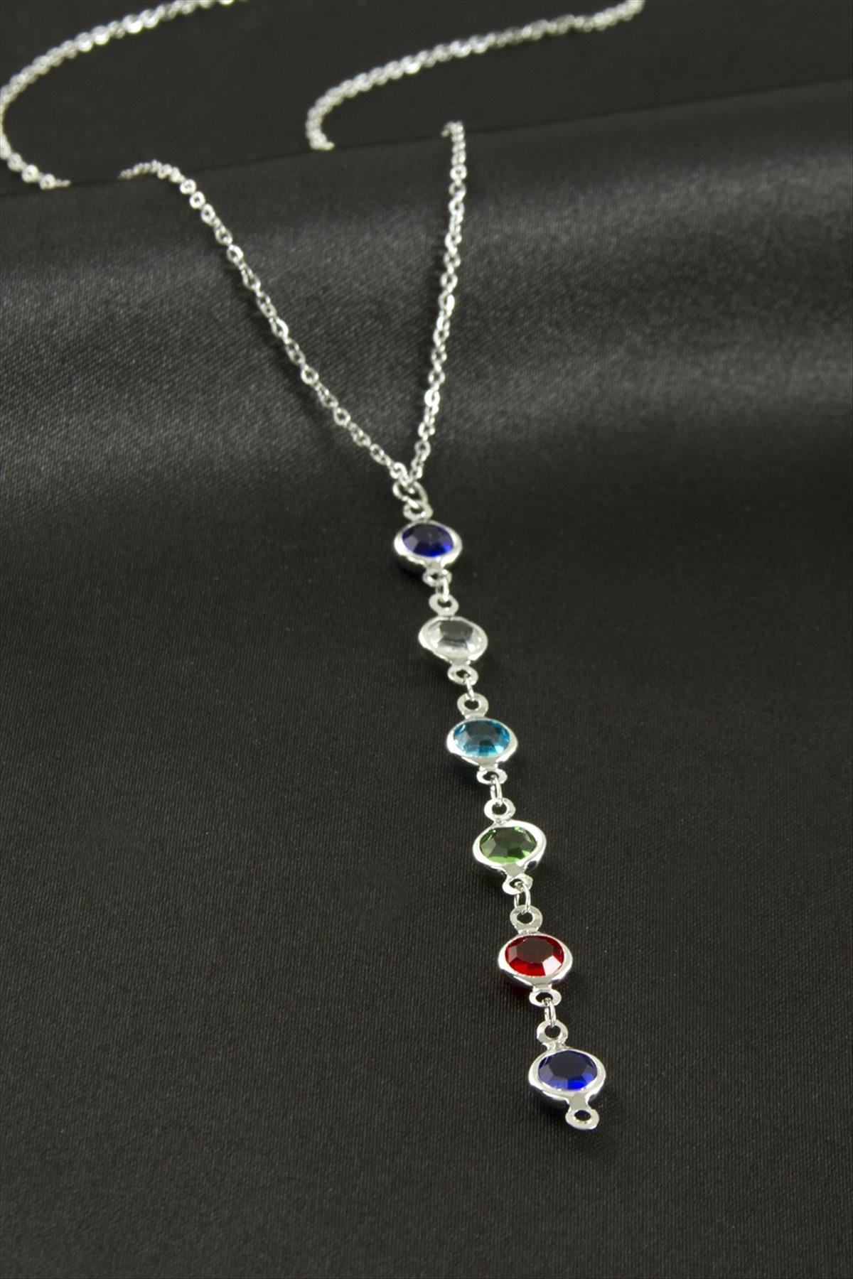 Kolye; Ürün malzemesi kristal taş ve çeliktir. Zincir uzunluğu 45 cmdir. Ürün ucunda sallantılı kristal taşlar vardır.