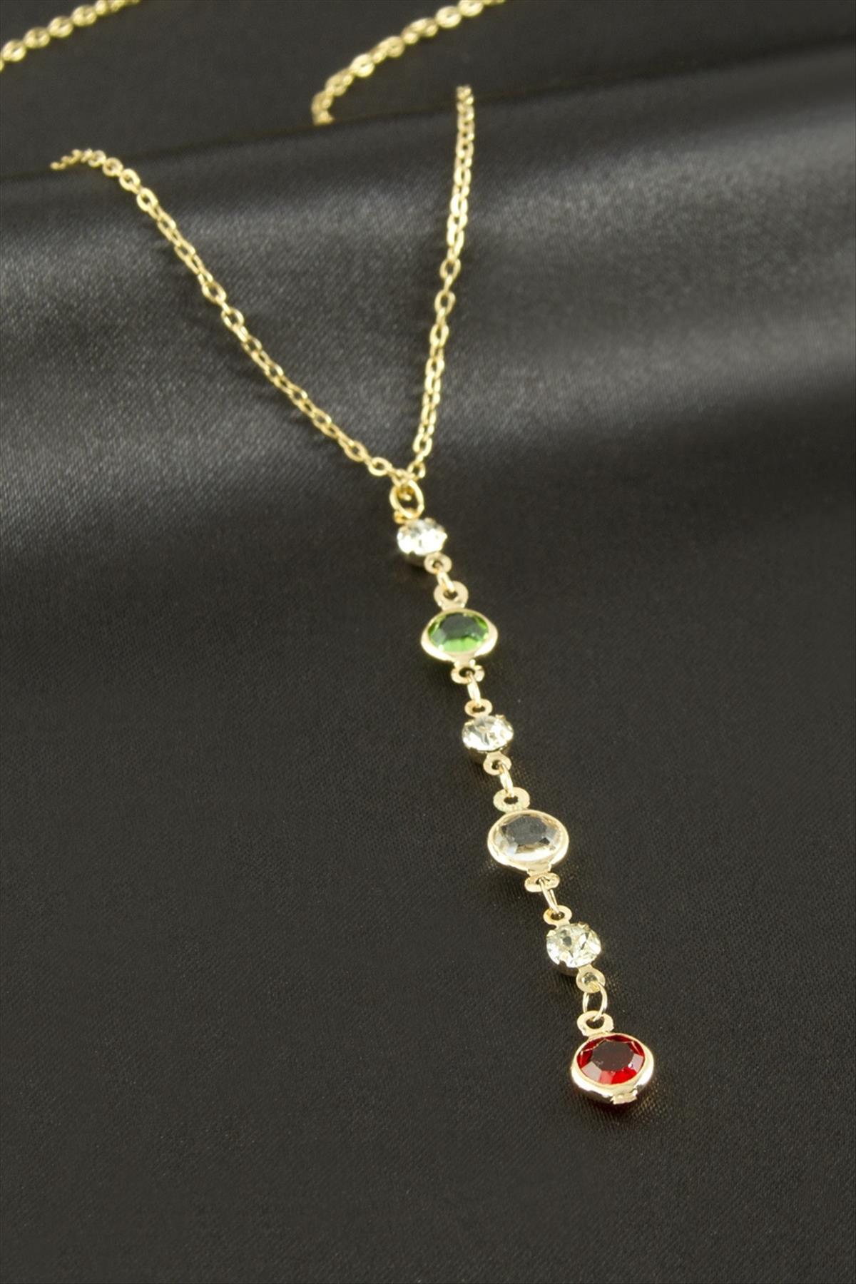 Kolye; Ürün malzemesi kristal taş ve metaldir. 1 sınıf kaliteli malzemeden üretilmiştir. Ürün boyu 54 cmdir. Kartlıdır.