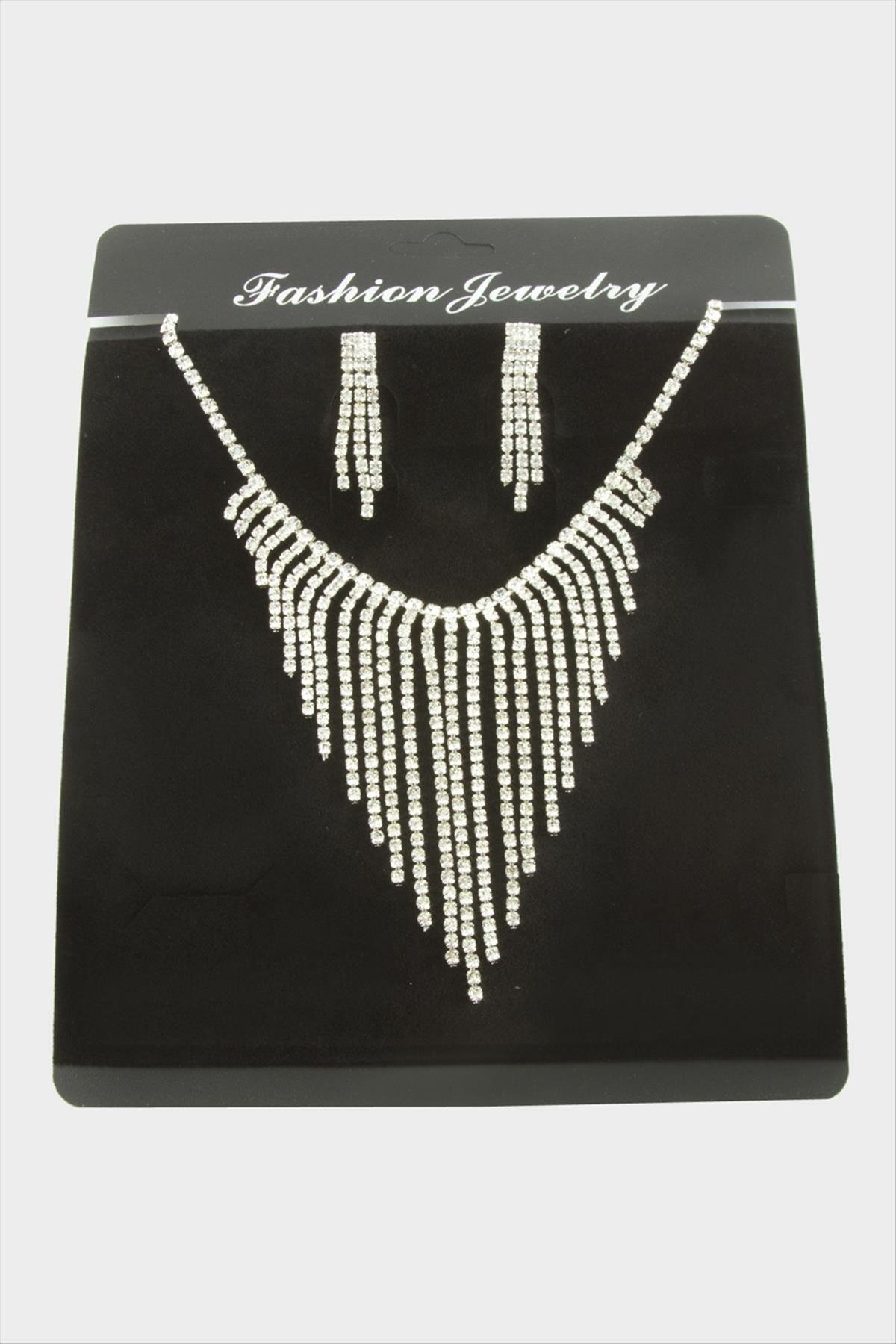 Set Kolye; Ürün malzemesi metal ve üzeri mıhlanmış taşlardan üretilmiştir. Ürün içersin de 1 çift küpe ve 1 adet kolye bulunmaktadır. Kolye uzunluğu 45 cm ve küpe uzunluğu 3 cmdir.