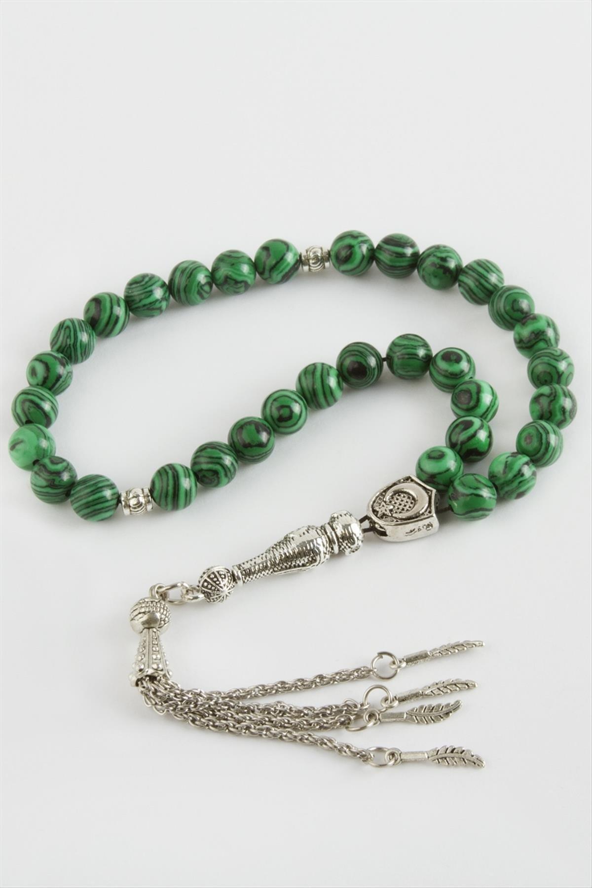 Tesbih; Gerçek Malahit doğaltaş tan imal edilmiştir. Taş boyutu 8 mmdir. Ürün püskülleri asortilidir. Resimde görünen püskül farklı olarak gönderilebilir.