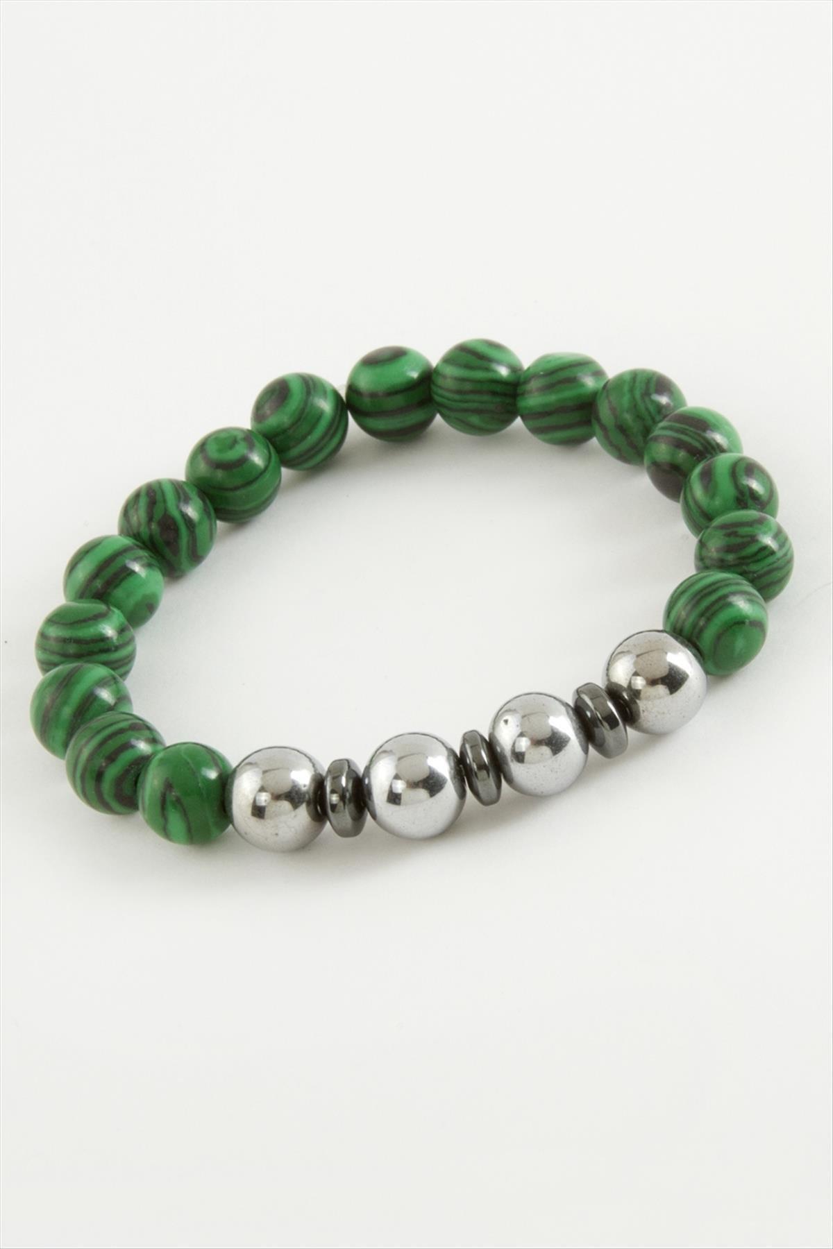 Bileklik: Ürün malzemesi malahitve hematit doğaltaşından imal edilmiştir. Misina üzerine dizilmiştir. Misina esneme özelliği bulunmaktadır.