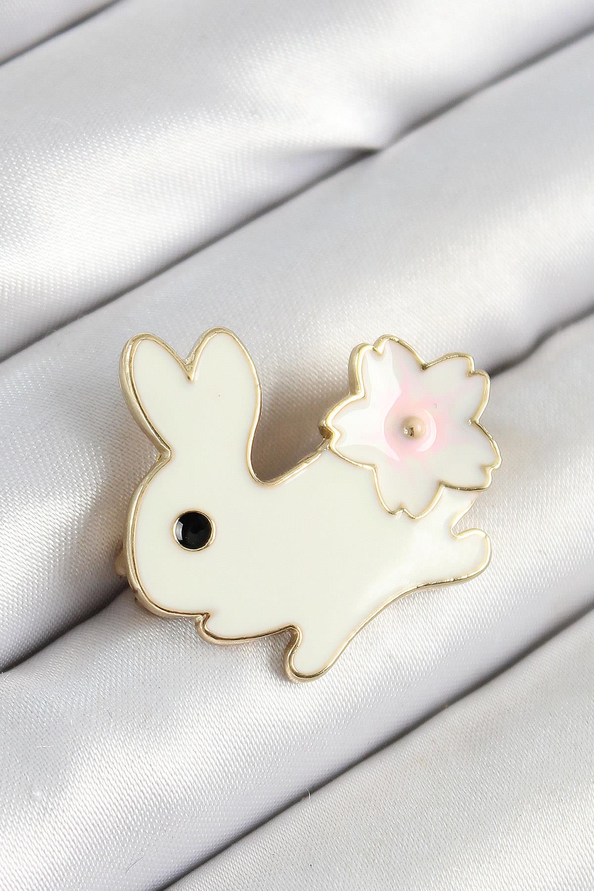 Mineli Çiçek Detaylı Krem Tavşan Figürlü Gold Renk Kadın Broş - PRT3500EB06342