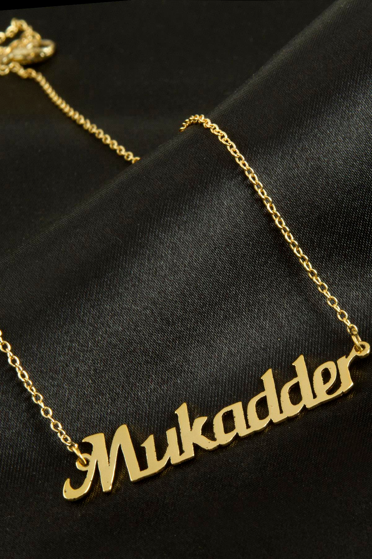 Mukadder isimli kolye. İsimli kolye pirinç madeninden ve altın kaplamalıdır. Kişiye özel üretilmektedir.Yazdırmak istediğiniz ismi bize mesaj olarak iletmeniz gerekmektedir. Kullanıma bağlı olarak uzun süre kullanıma uygundur. Ürün malzemesi 1.sınıf kalitededir. Ürün ve zinciri sarı renktedir. Ürün zincir boyu 45 cm ve ürün üzerindeki isimler yaklaşık 3 cmdir. İsim boyları ürün ismine göre degişiklik göstermektedir.