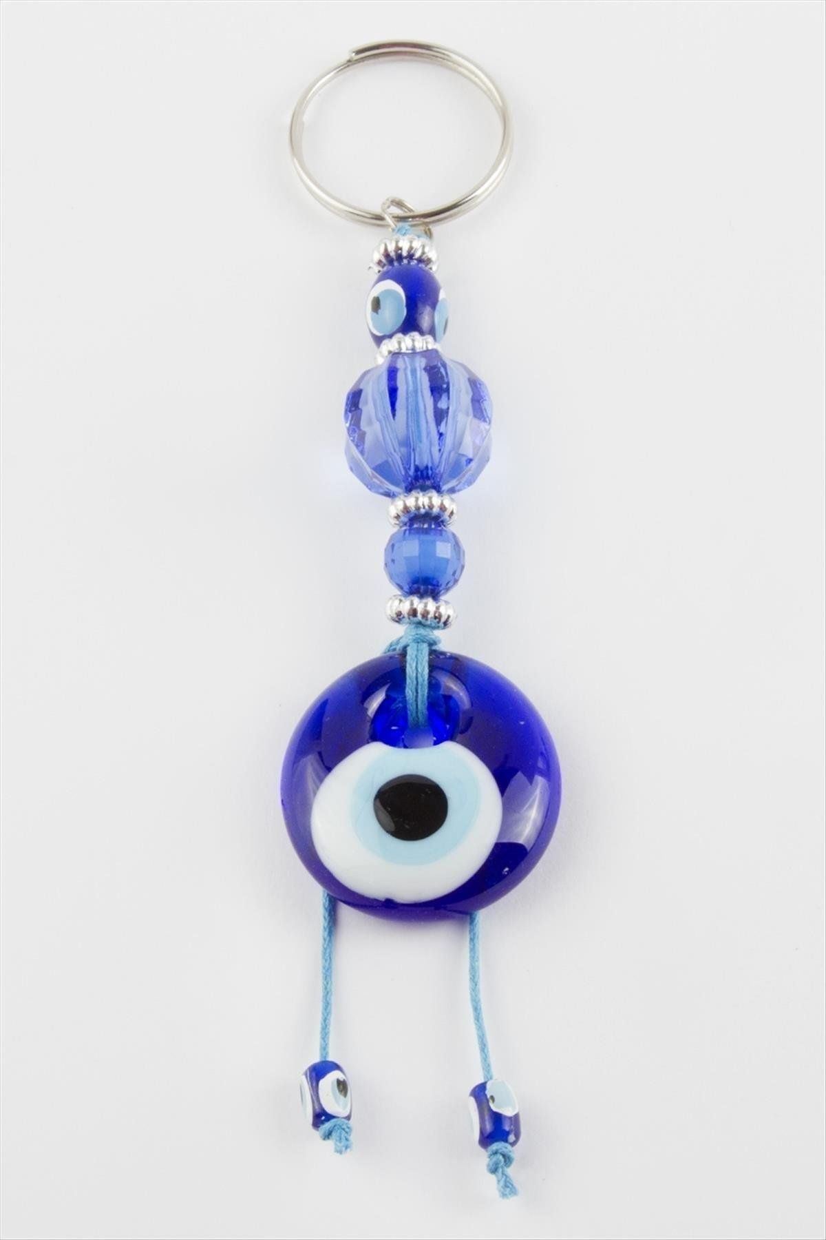 Anahtarlık; Ürün malzemesi cam, metal ve boncuktur. Ürün boyu 10 cmdir. Ürün ucundaki nazar camdır. Sallantılı figürler plastiktir.