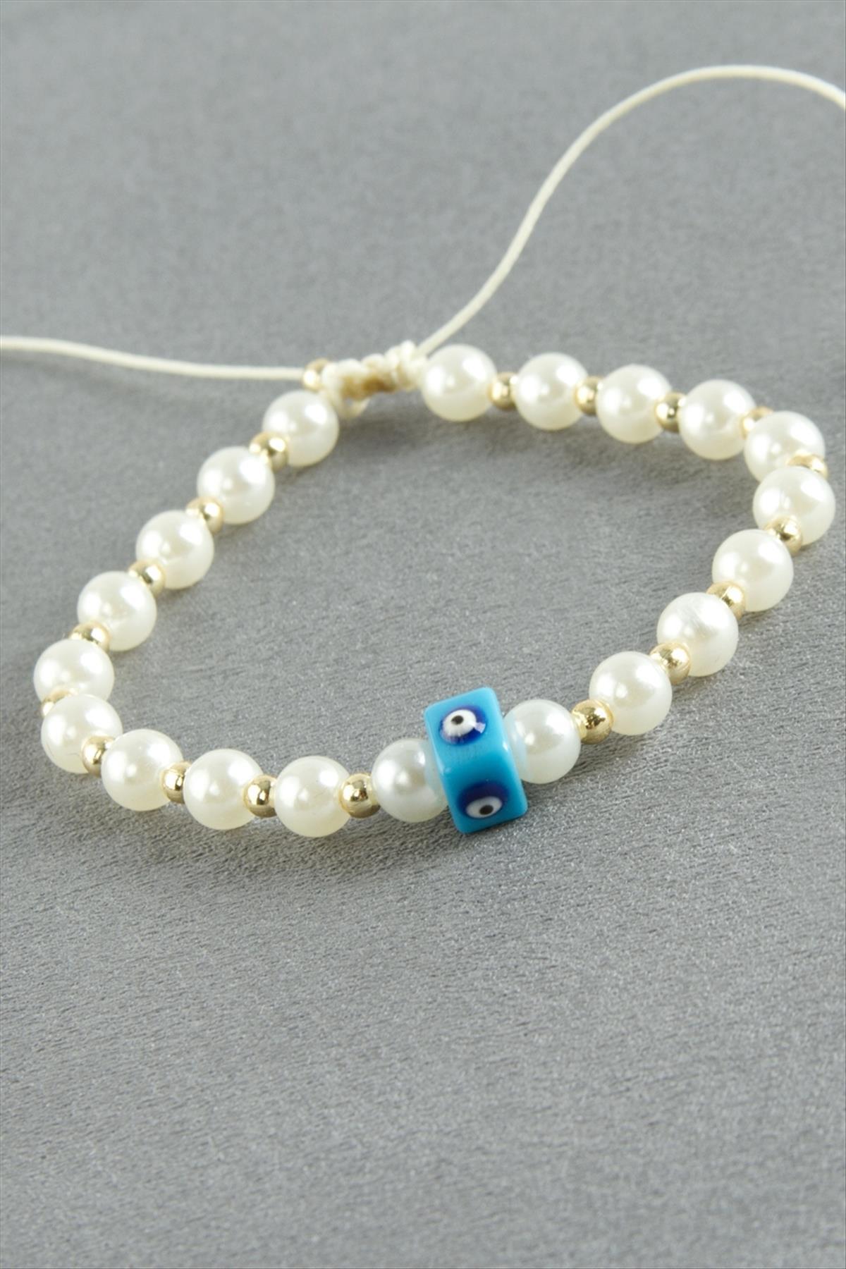Bileklik; Ürün malzemesi inci ve makrome iptir. Ürün arkası asansörlüdür. Bileğe göre ayarlanabilir.