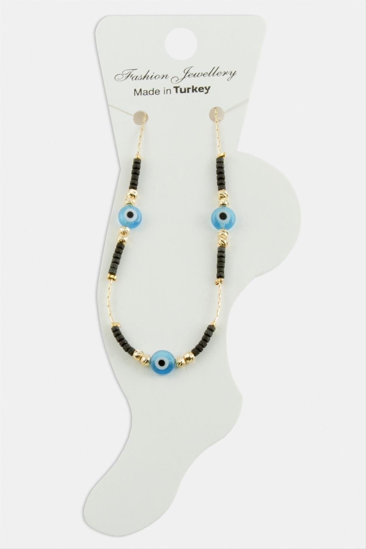 Halhal; Ürün malzemesi metal ve miyoki boncuktur. Ürün zincir uzunluğu 22 cmdir. Kartıyla beraber gönderilecektir. Ürün nazar boyu 0,5 cmdir.
